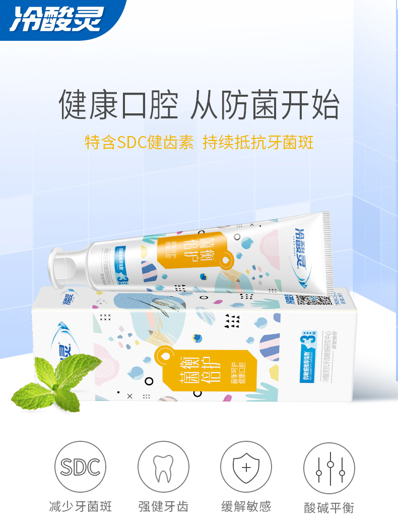 冷酸灵菌衡护敏牙膏:清爽薄荷香、莹白膏体。含抗敏感活性因子,缓解牙齿敏感疼痛;特含SDC健齿素,能持续抵抗牙菌斑;弱碱性膏体,维护口腔酸碱度平衡。