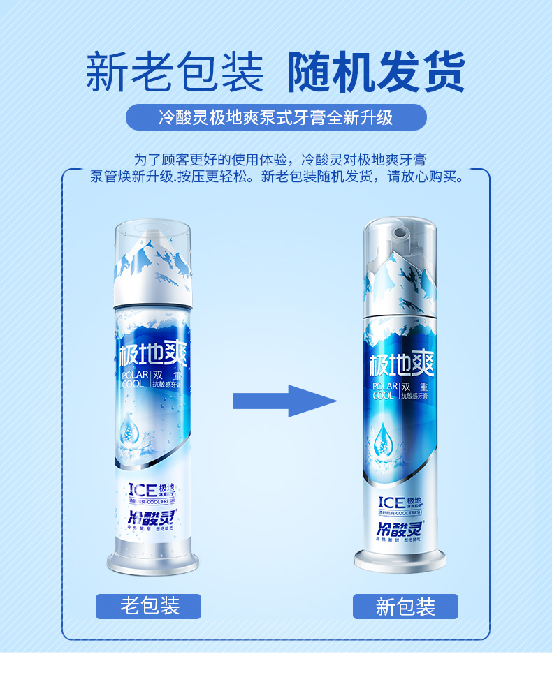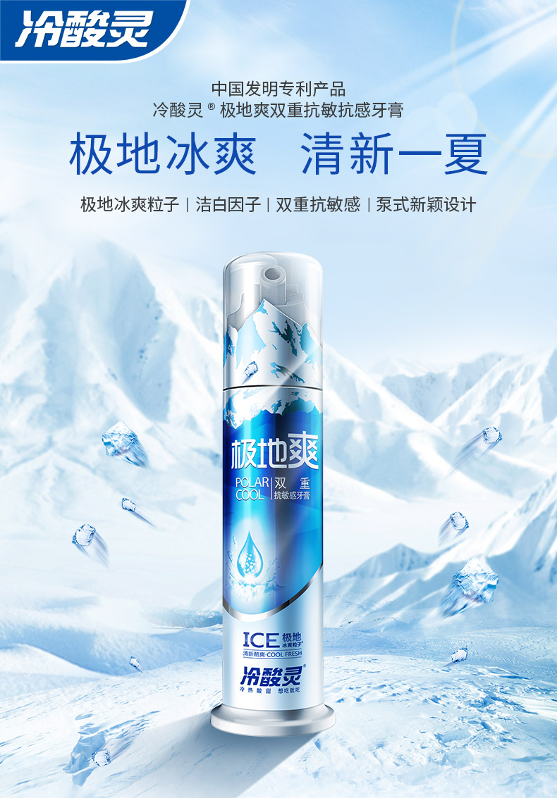 冷酸灵极地爽泵式牙膏:冰凉薄荷香、炫彩晶蓝膏体。特含极地冰爽粒子,双重抗敏感配方。
