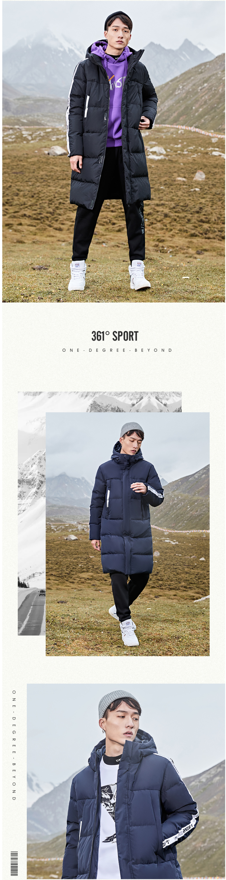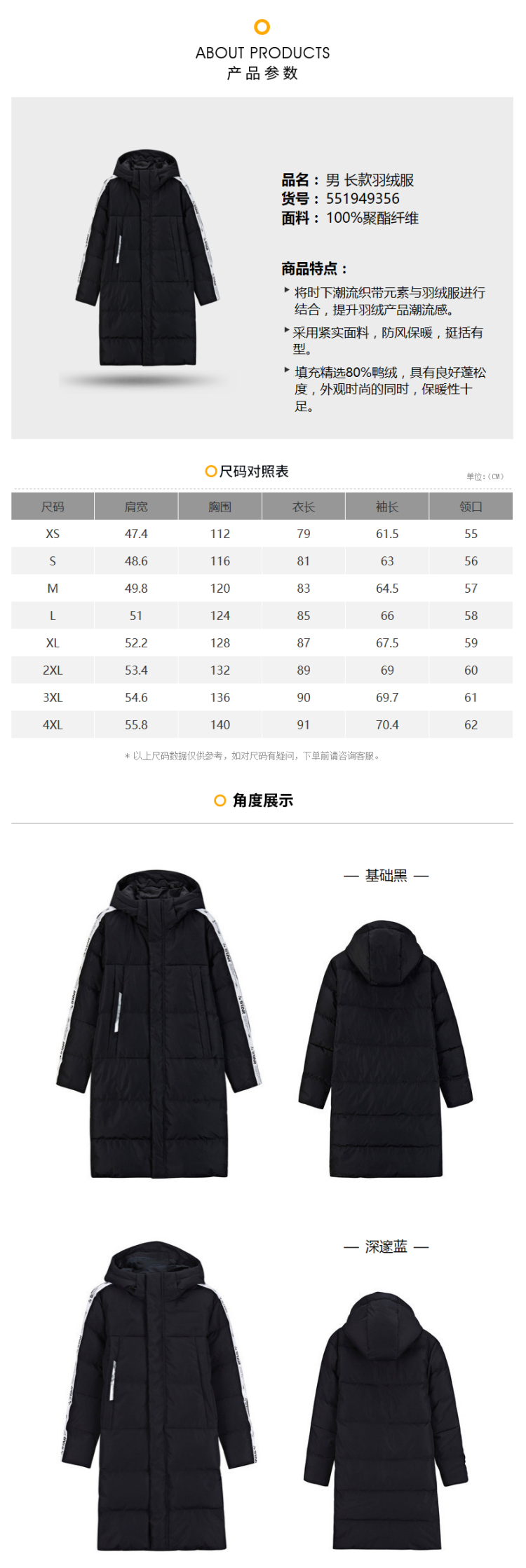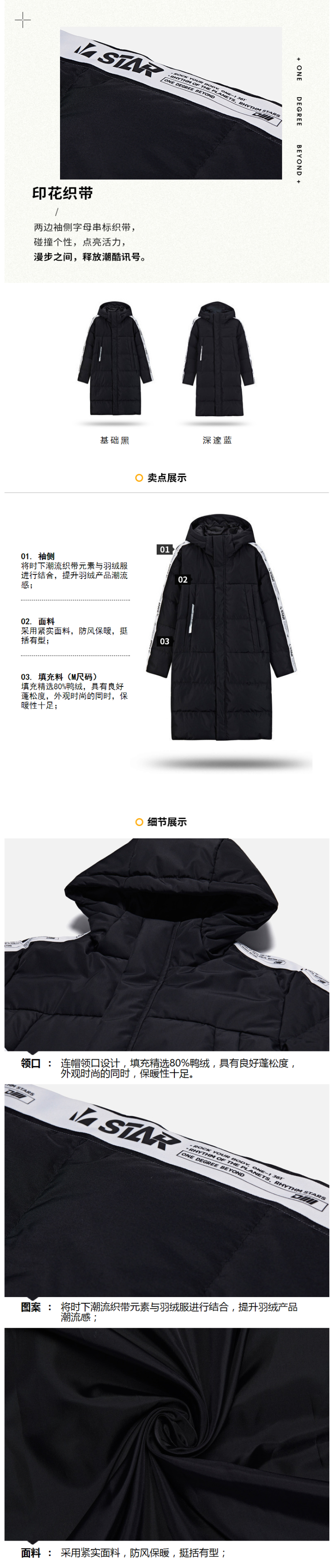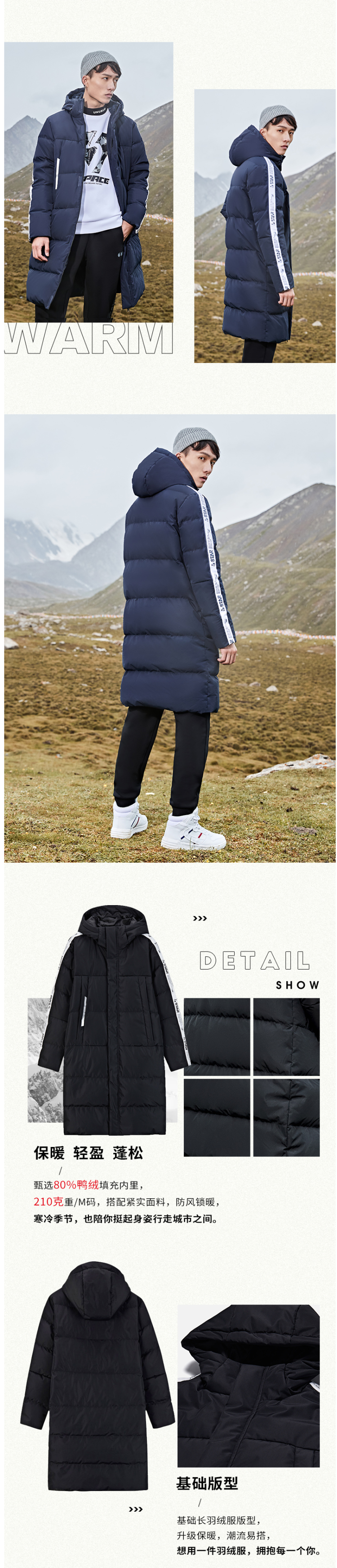 在款式上,标准版型,长款及膝,增加了保暖效果,同时上身也更好看。高领+一体连帽,可以护住脖子。双重门襟、双层袖口设计,内里是罗纹,防风又保暖。两边袖侧字母串标织带,展现潮流个性。两侧口袋有拉链,置物安全。