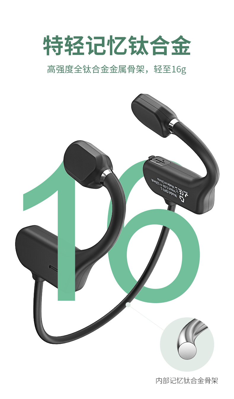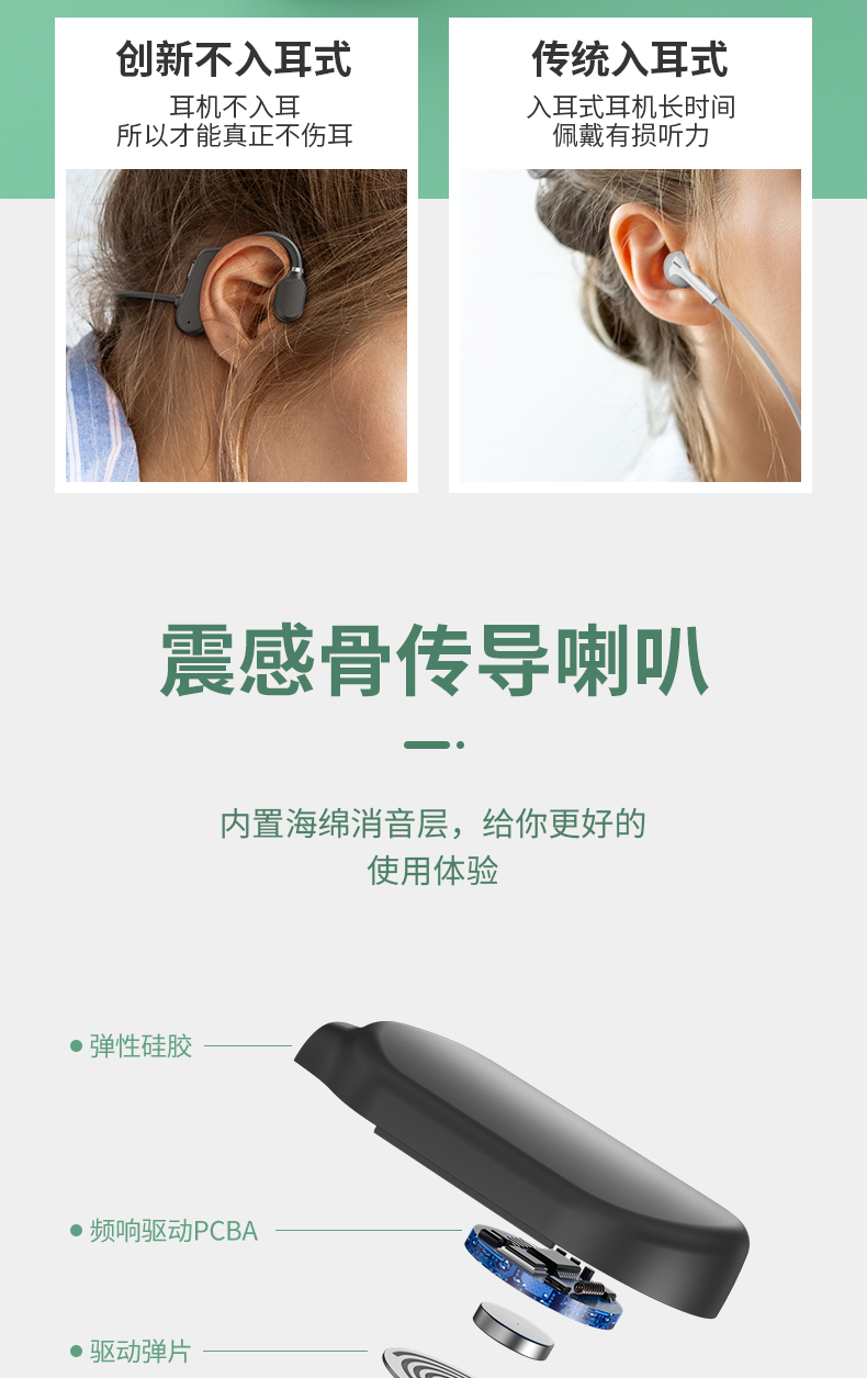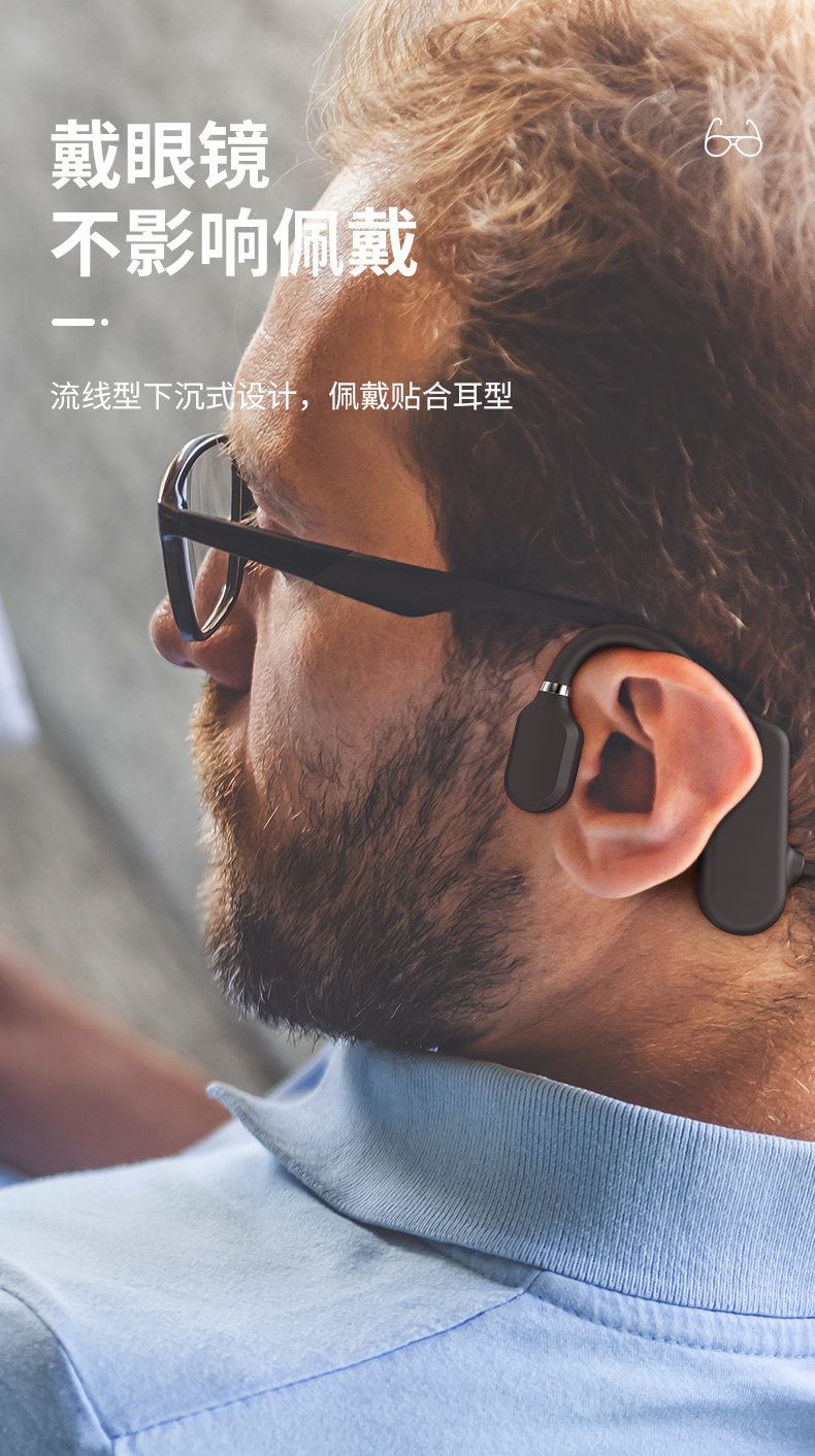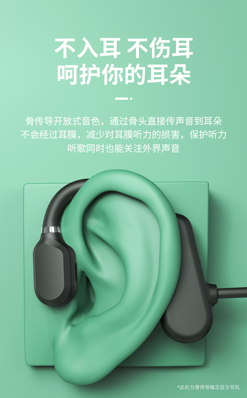 黑科技骨传导 不入耳真无痛。骨传导技术,双耳开放式设计,使声音的传递不经过鼓膜,减少鼓膜损伤;不用把耳机塞进耳朵,保持对周围环境的警觉,更加安全;耳道的开放不易滋生细菌,更加卫生健康。