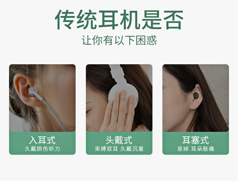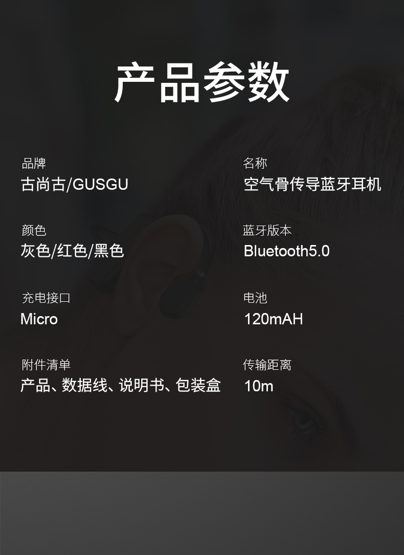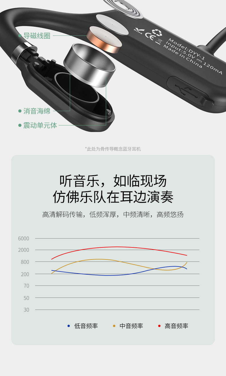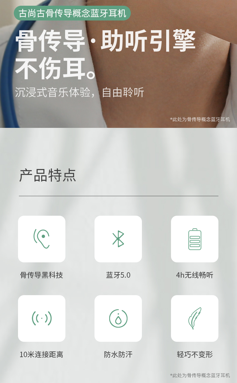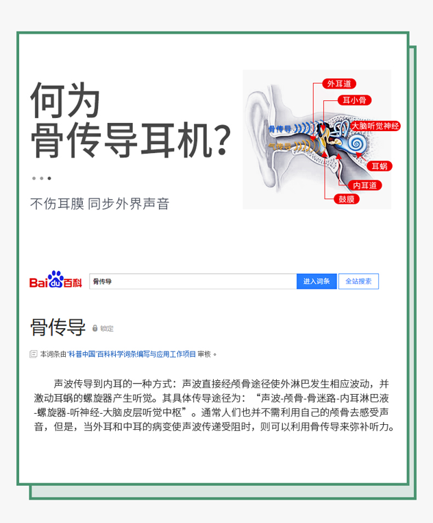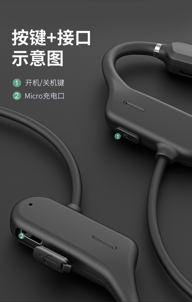 黑科技骨传导 不入耳真无痛。骨传导技术,双耳开放式设计,使声音的传递不经过鼓膜,减少鼓膜损伤;不用把耳机塞进耳朵,保持对周围环境的警觉,更加安全;耳道的开放不易滋生细菌,更加卫生健康。
