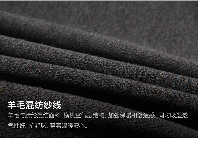 羊毛与腈纶混纺成的面料,运用横机空气层结构制成的面料柔软细腻,吸湿透气性好、抗起球,还能起到加强保暖和舒适度,兼顾挺括版型的功效,非常适合冬季穿。