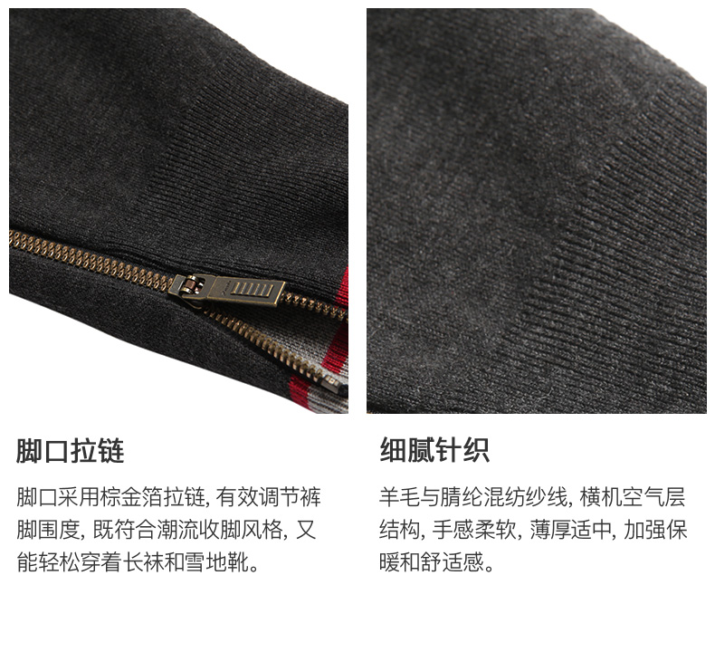 脚口有棕金箔拉链,能有效调节裤脚围度,既符合潮流收脚风格,又能轻松穿着长袜和雪地靴,裤脚还有弹力收口。