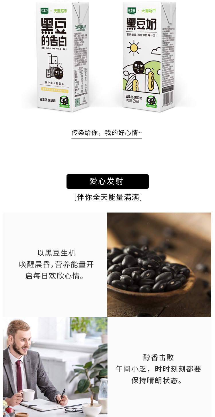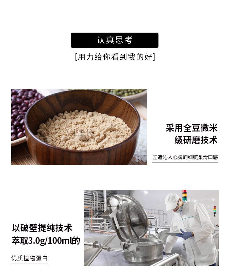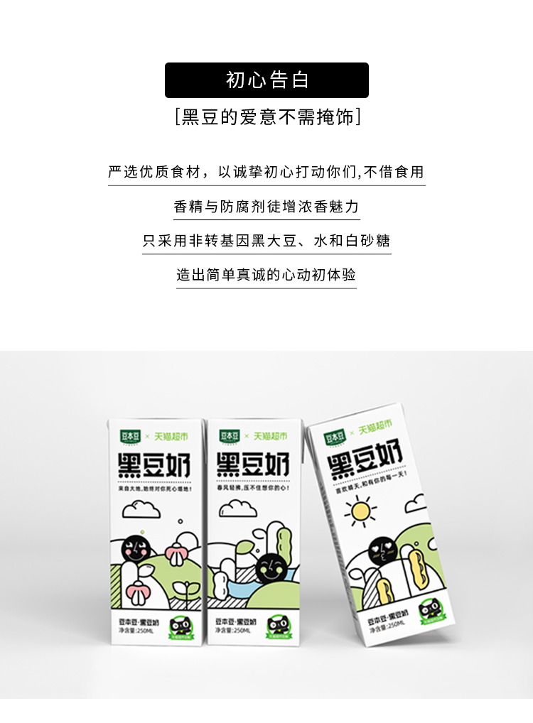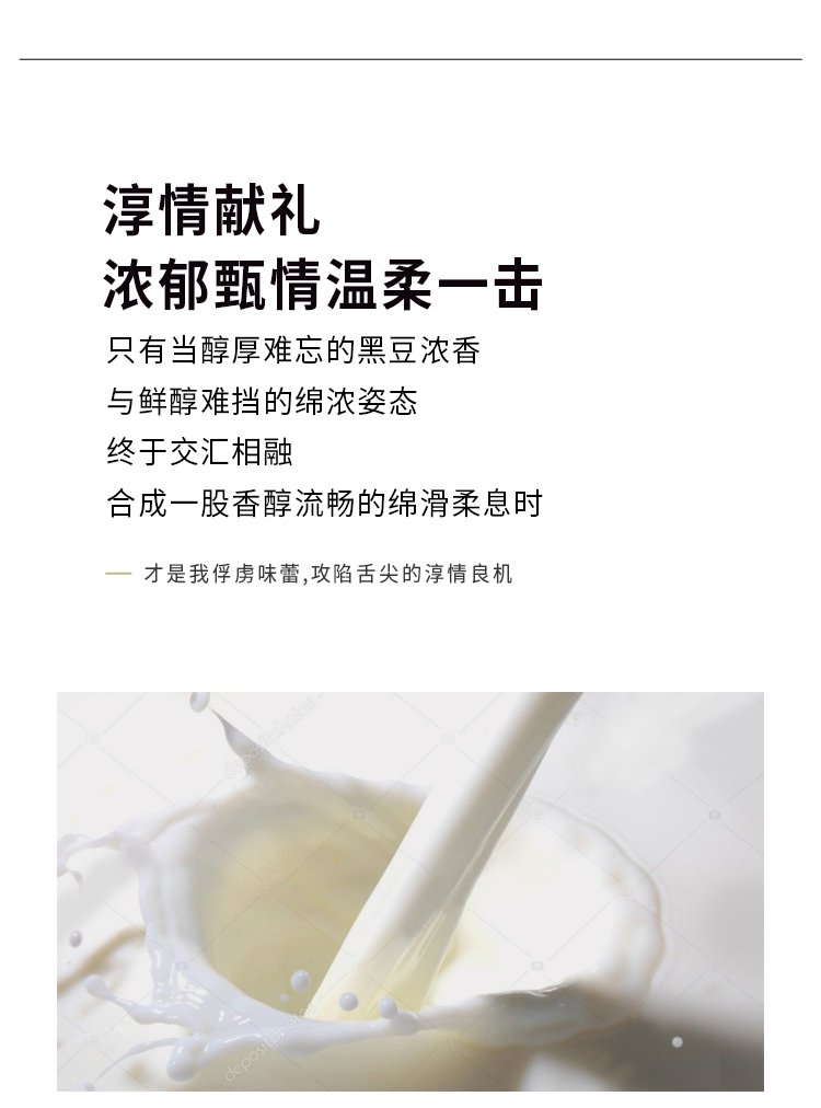 严选非转基因黑大豆为原料,全豆微米级别研磨技术,破壁提纯技术萃取,每100ml含3.0g优质植物蛋白,醇黑营养,口感香浓丝滑不添加食用香精和防腐剂,无菌灌装,还原本味。