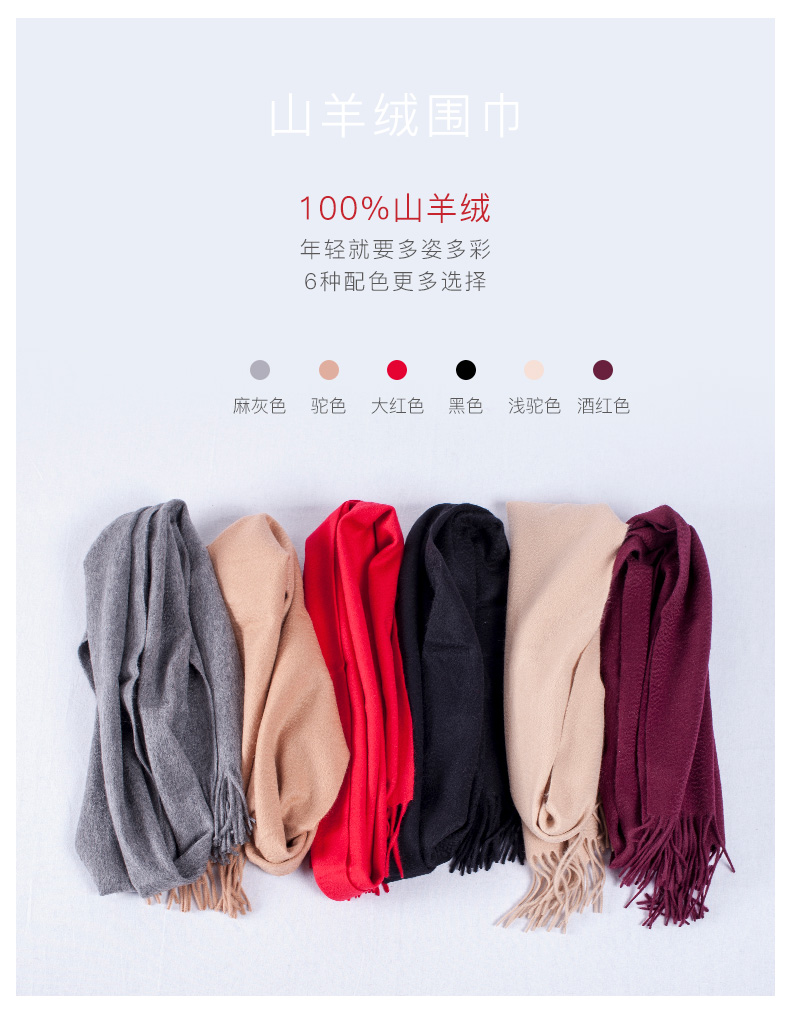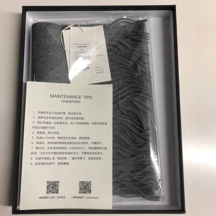 本米的这款羊绒围巾,用是阿尔巴斯山羊的羊绒,其纤维弹性、长度、细度、白度、色泽等方面超出一般水准,挑选其中不超15.5微米的高档A级羊绒,成品手感细腻滑糯,300mm*1800mm的尺寸,刚好护住脖子又不累赘。