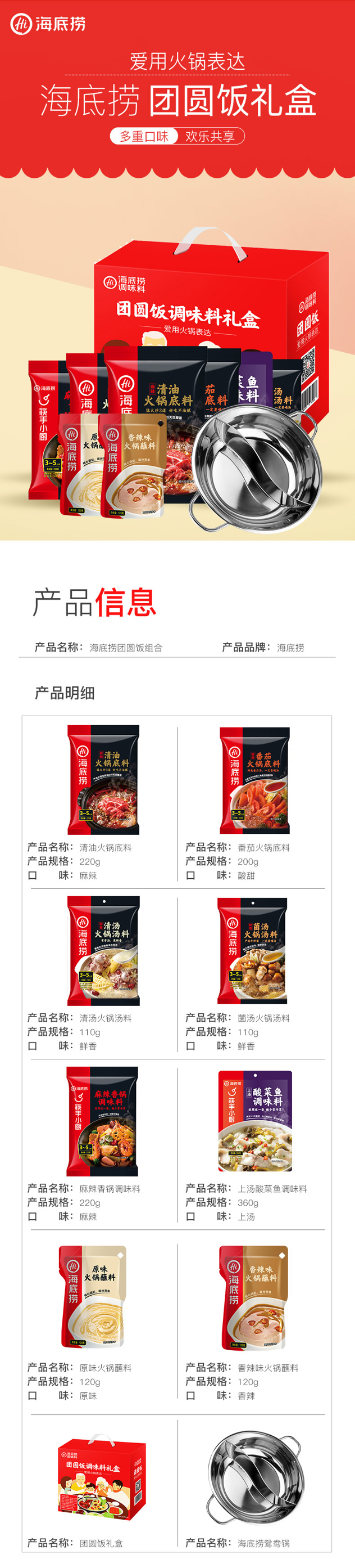 海底捞同款礼盒,具体包含清汤火锅底料 220g、番茄火锅底料 200g、清汤火锅汤料 110g、菌汤火锅底料 110g、麻辣想过调味料 220g、上汤酸菜鱼调味料 360g、原味火锅蘸料 120g、香辣味火锅蘸料 120g、直径30cm鸳鸯锅,底料无需炒制,直接煮食,简单方便,天冷了就适合在家打火锅~