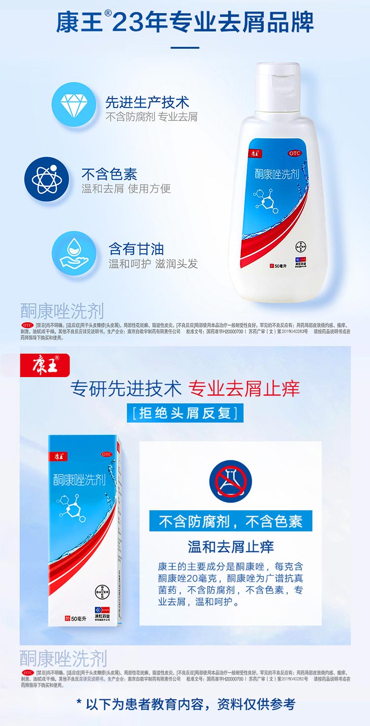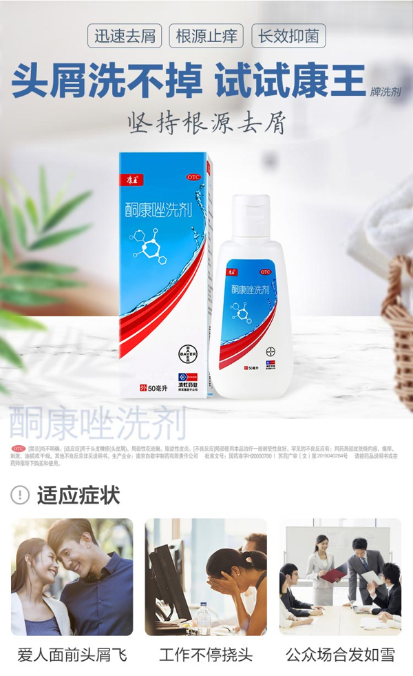 规格:50ml*3瓶。康王是滇虹药业旗下品牌,14年滇虹药业正式被拜耳集团收购,康王酮康唑洗剂也是那时候成为家喻户晓的去头屑非处方药品。