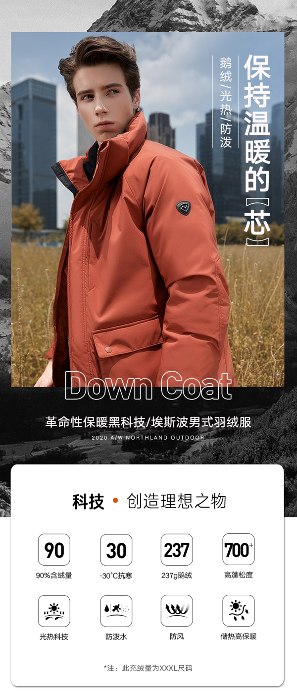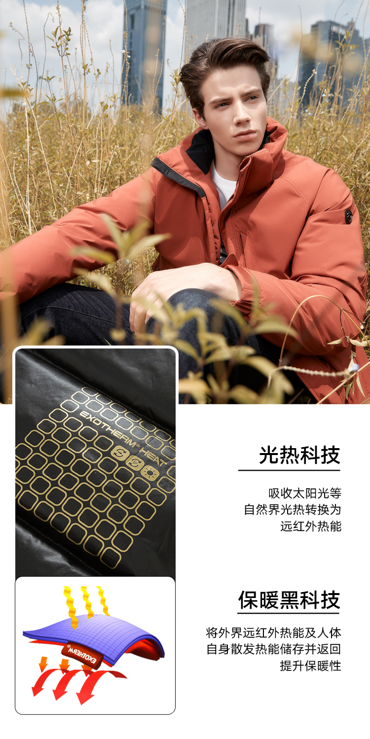 这款羽绒服填充700蓬187克90%鹅绒,采用德国进口设备高温灭菌,能抵抗零下30度严寒。一般来讲,鹅绒成本约是普通鸭绒的数倍,没有鸭毛的腥味,蓬松度更高,保暖效果也更好。羽绒服还采用光热科技与保暖黑科技,能吸收太阳光和人体热能并存储,并以远红外的方式返回人体,极大提升保暖性。