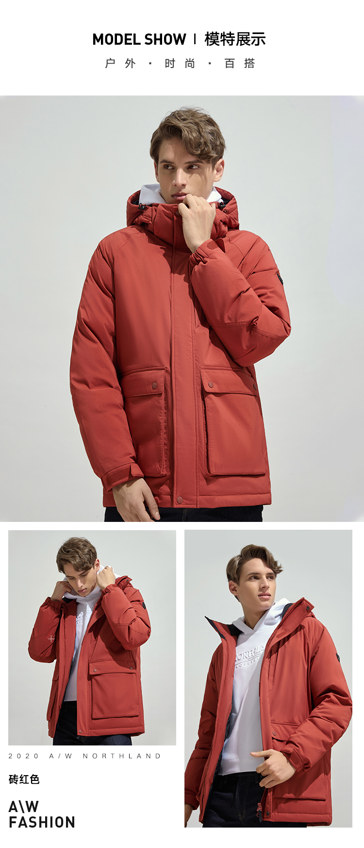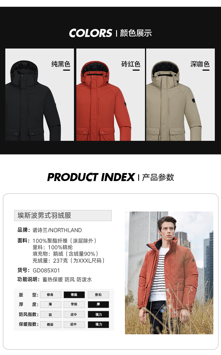 面料拥有防风防泼水功能,4层锁绒工艺:面布、双层胆布、高密里布和德国防绒针,有效防止钻绒,接近0跑绒。细节方面,全身全部采用日本高品质YKK拉链,提拉顺畅;高领连帽设计,防止冷风灌入,细节精致到位。简约纯色款式,百搭穿着。