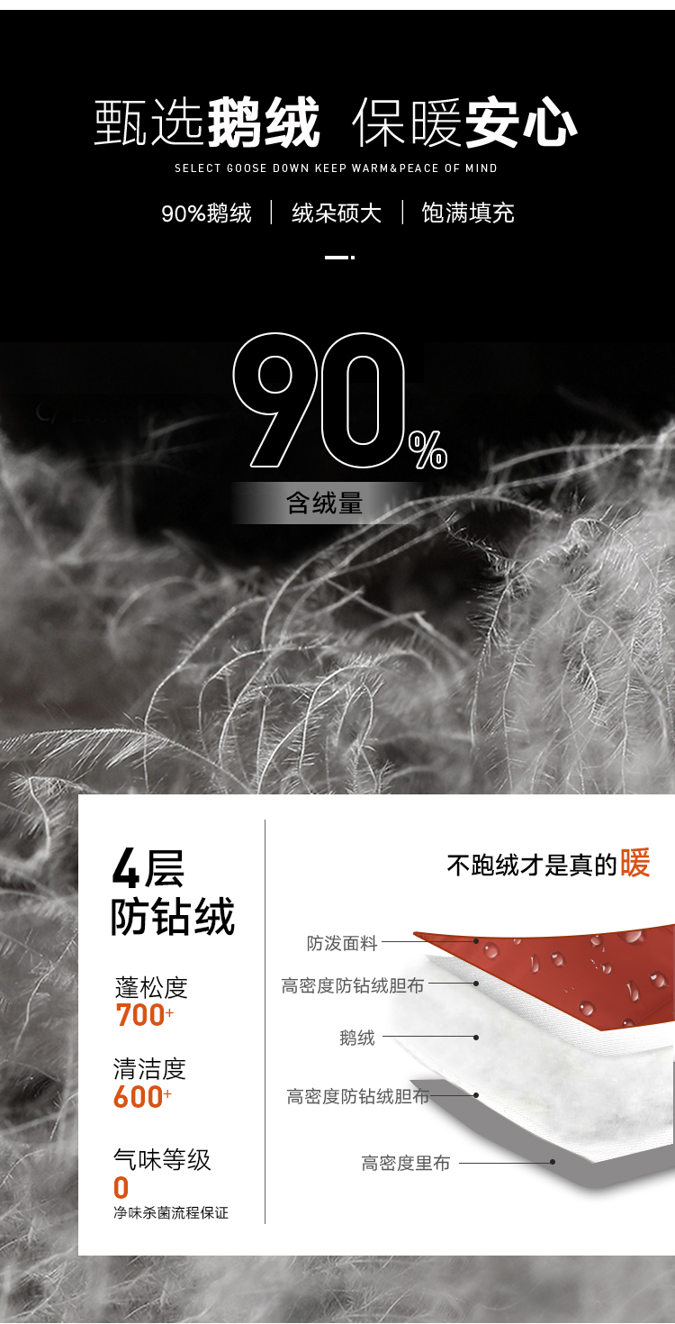 光热保暖科技 700高蓬松鹅绒 含绒量90%。