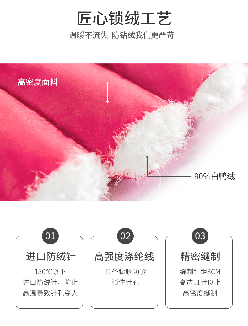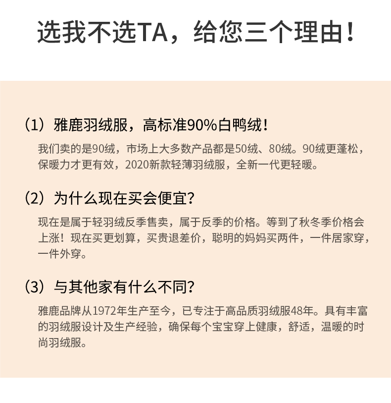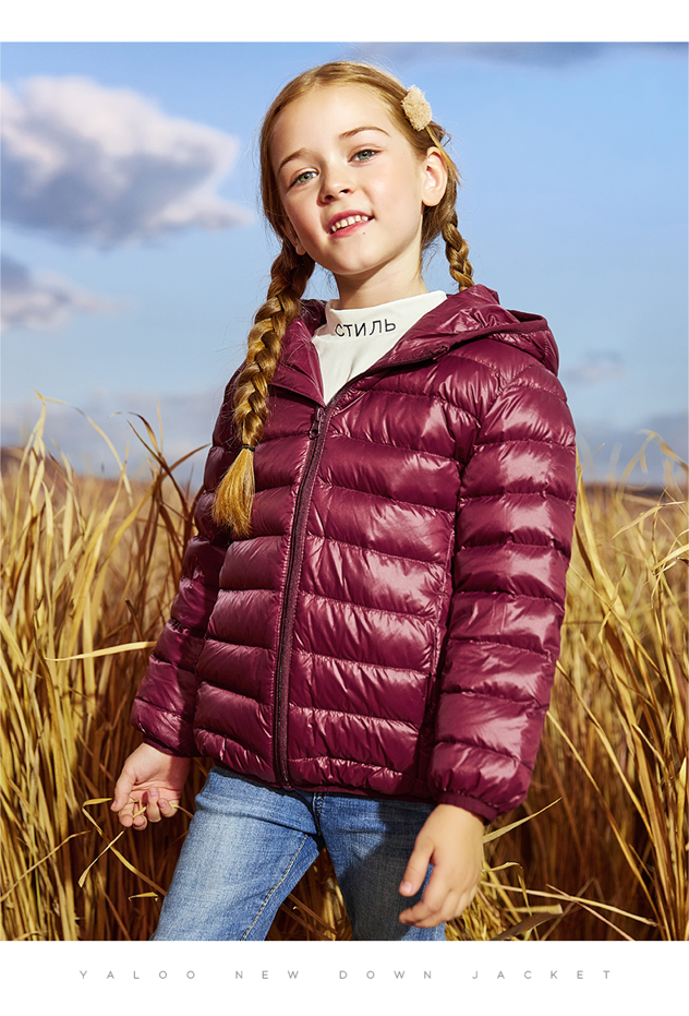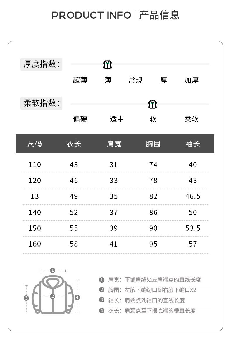 两款可选,这款雅鹿儿童羽绒服,修身轻薄款式,适合春秋比较冷和冬季不太冷时穿,选用高品质的大朵绒白鸭绒,不含杂质,含绒量高达90%,充绒量不到100g,轻暖无压迫感。大身是高密聚酯面料,舒适透气,防钻绒、防泼水,耐脏易清洗。