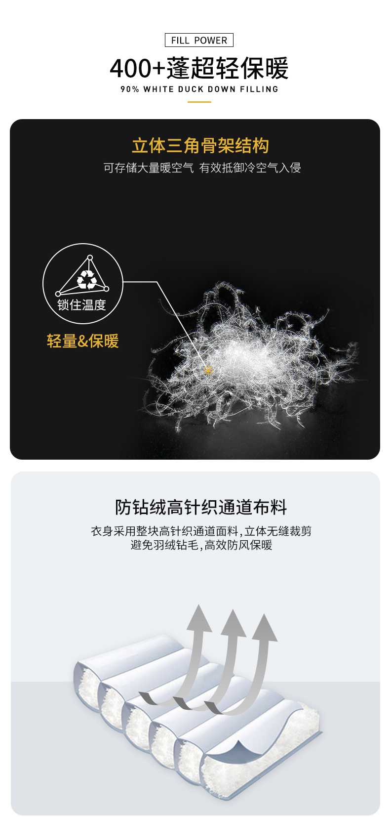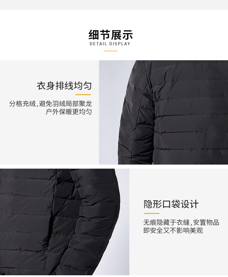 外层采用整块高针织通道布料,立体无缝剪裁,能有效避免羽绒钻绒,高效防风保暖。简单立领,弹力袖口和下摆,两侧是隐形口袋,配细拉链,实用好看。