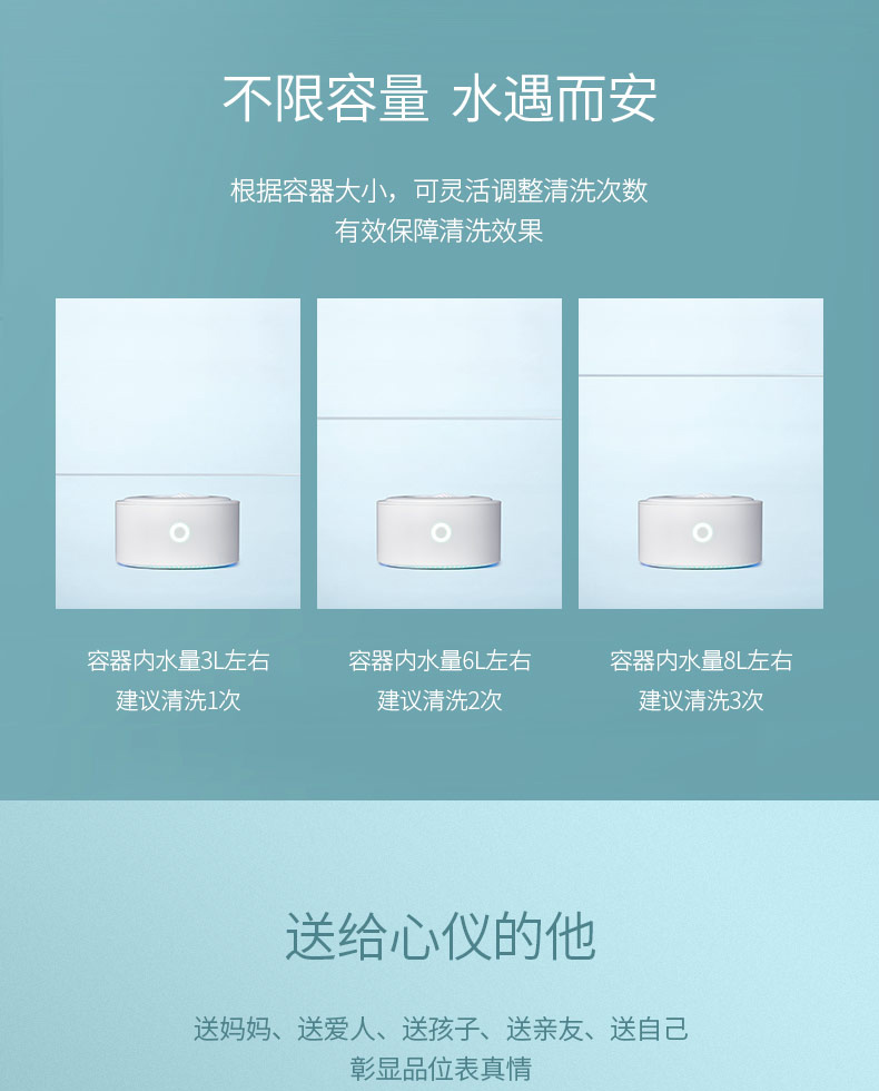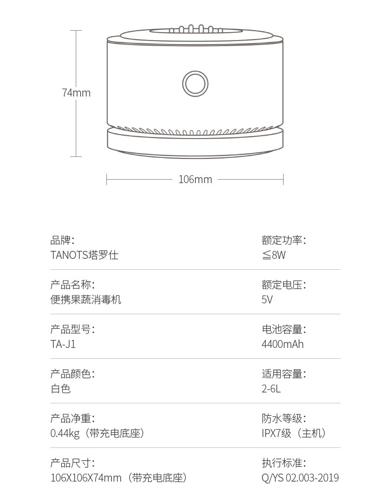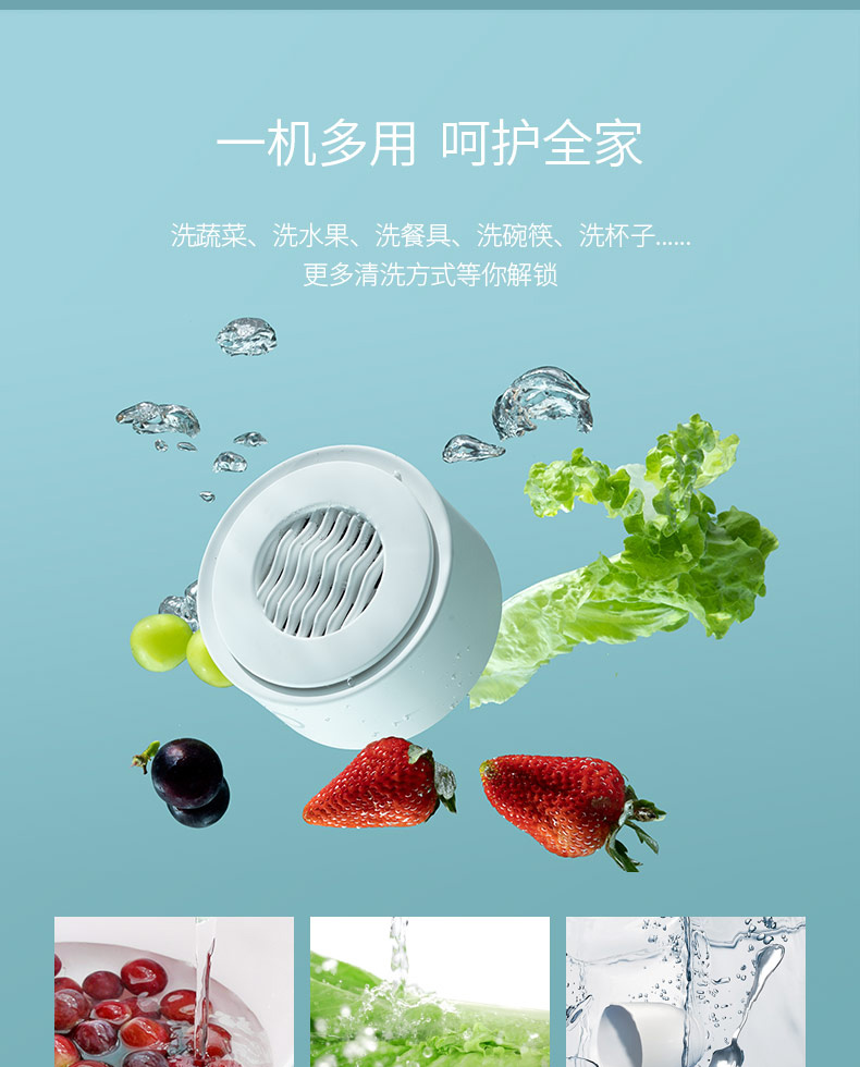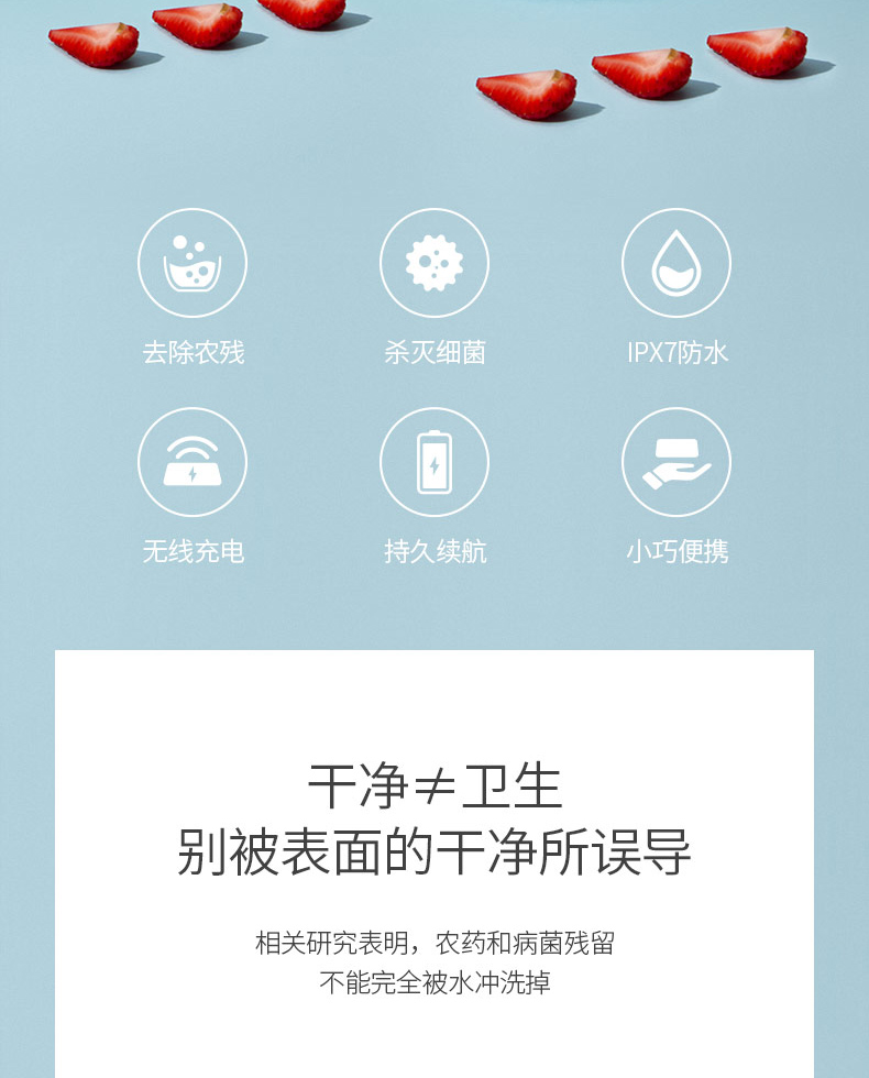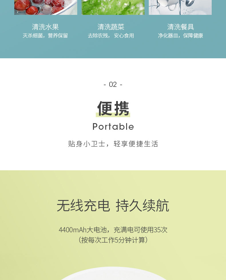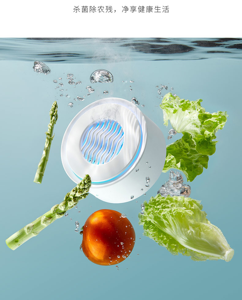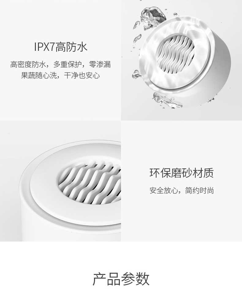 内置4400mAh大容量电池,IPX7防水,无线充电,直接放入水中即可使用,单次充电可使用35次以上,不管是在家还是出差,都能吃到安心无农残的蔬菜水果。