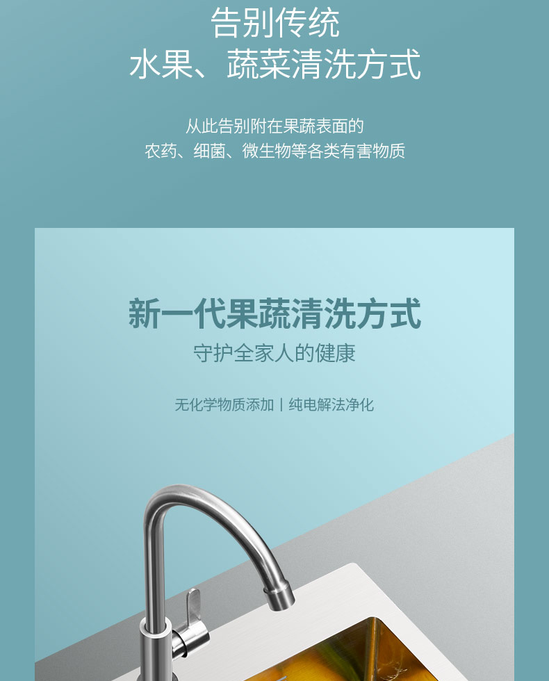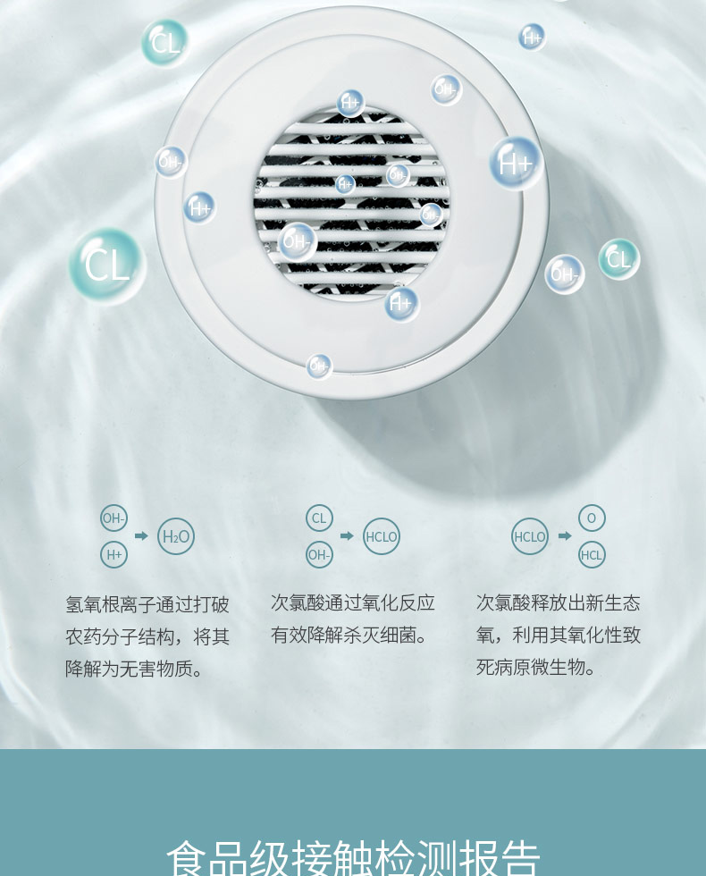 这款清洗机的主要原理是,先用离子发生器将水打碎成氢氧根离子,进而打破农药的分子结构,然后释放次氯酸,通过氧化反应,有效降解杀灭细菌,然后次氯酸释放出新生态氧,利用其氧化性杀死病原微生物。对农药的降解效果≥90%,杀菌效果≥99.99%。