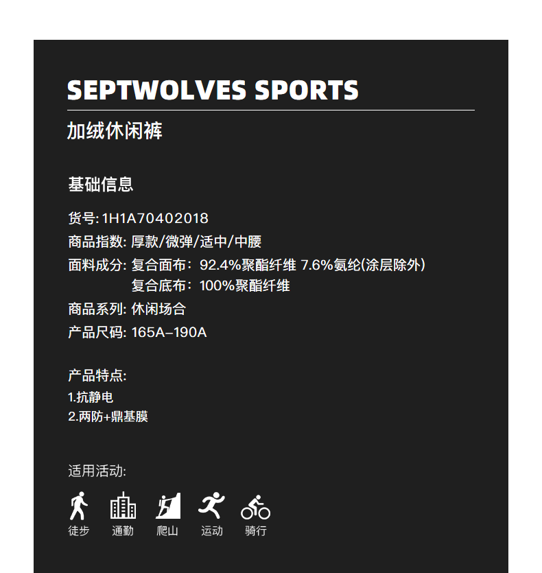 这款七匹狼加绒加厚直筒休闲裤是一款软壳裤,2020年的冬季新款,使用92.9%聚酯+7.6%弹性氨纶的复合软壳面料,摸起来的手感柔软不是很硬,外层是梭织的软壳面料,可达97%防风,还经过防泼水处理。