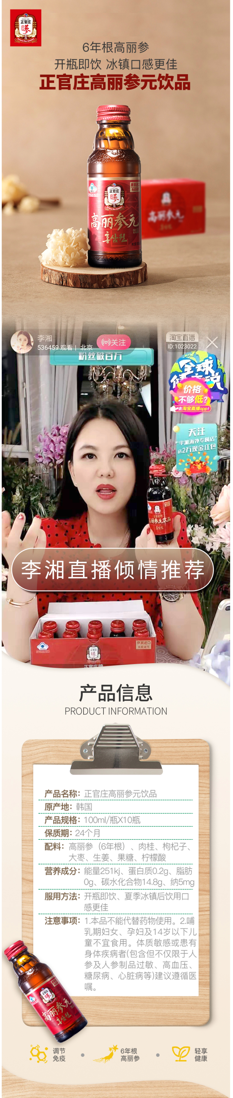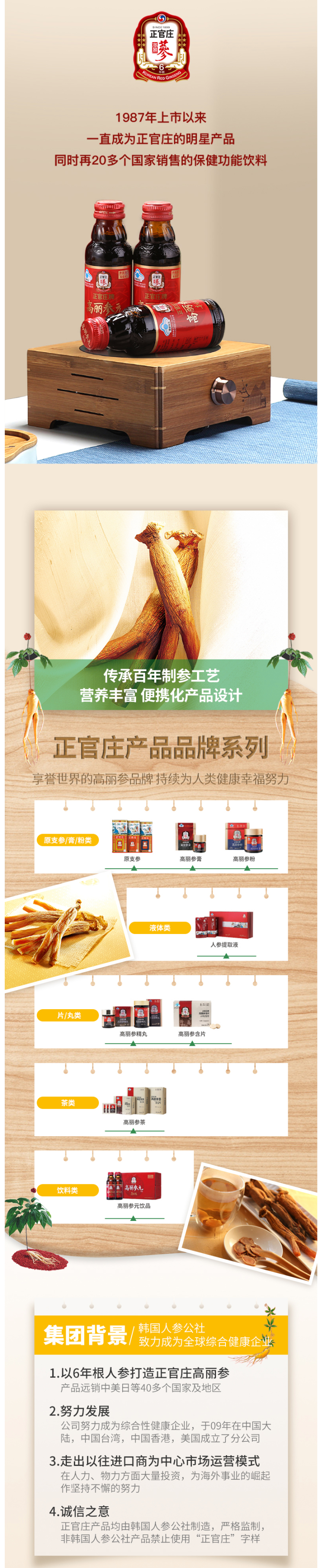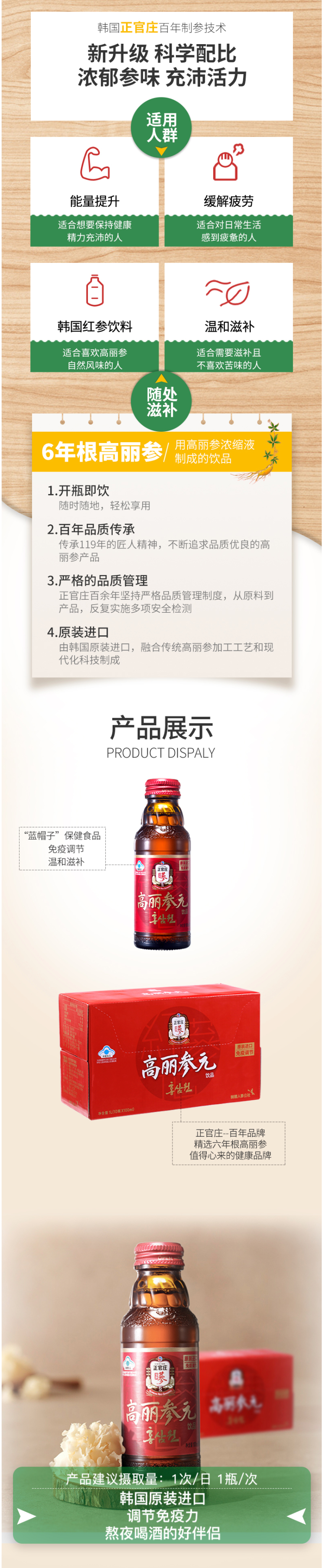 这款正官庄6年根高丽参元液,以6年根高丽参为原材料(高丽参富含32种人参皂甙),在以大枣、肉桂、枸杞子、生姜浓缩液为辅料。特点是易吸收,每支人参皂甙含量达10-20mg。服用方法:1日1次。能够大补元气,提高记忆力,小瓶包装,携带十分方便,可以随时随地饮用来增强活力。