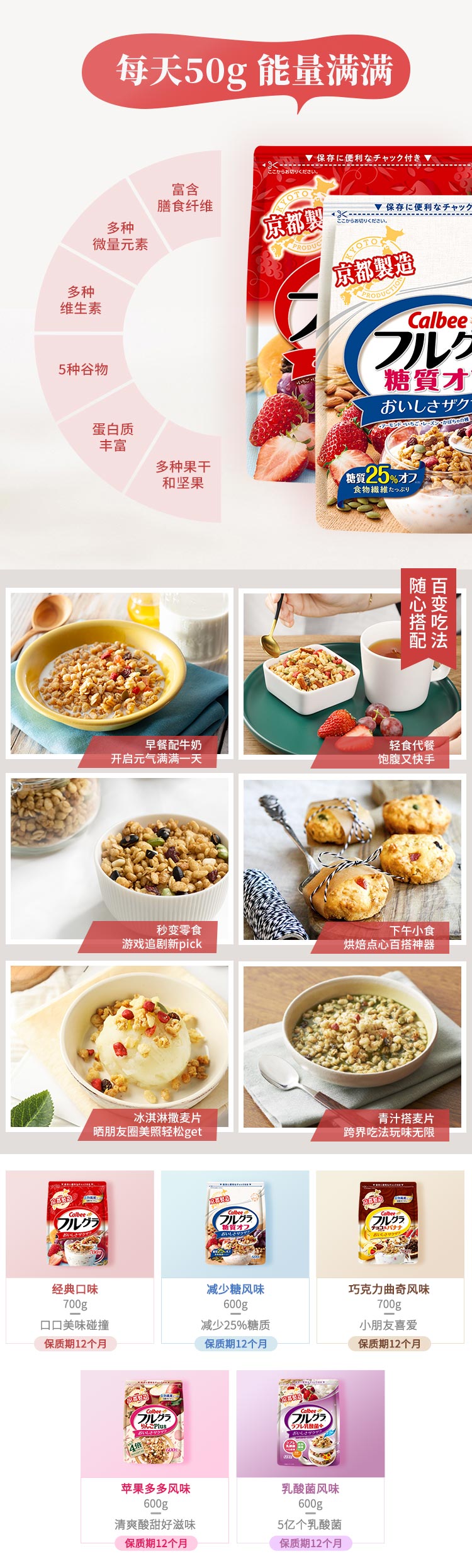 Calbee是日本销量第一的麦片卡乐比编辑经常买,无论是单吃或者冲泡都很好吃,经典口味口感比较甜。含有草莓干、苹果干、木瓜干、葡萄干、南瓜子、大杏仁、椰子、燕麦、黑麦粉等12种水果谷物,口感丰富,富含膳食纤维、维生素和铁物质。