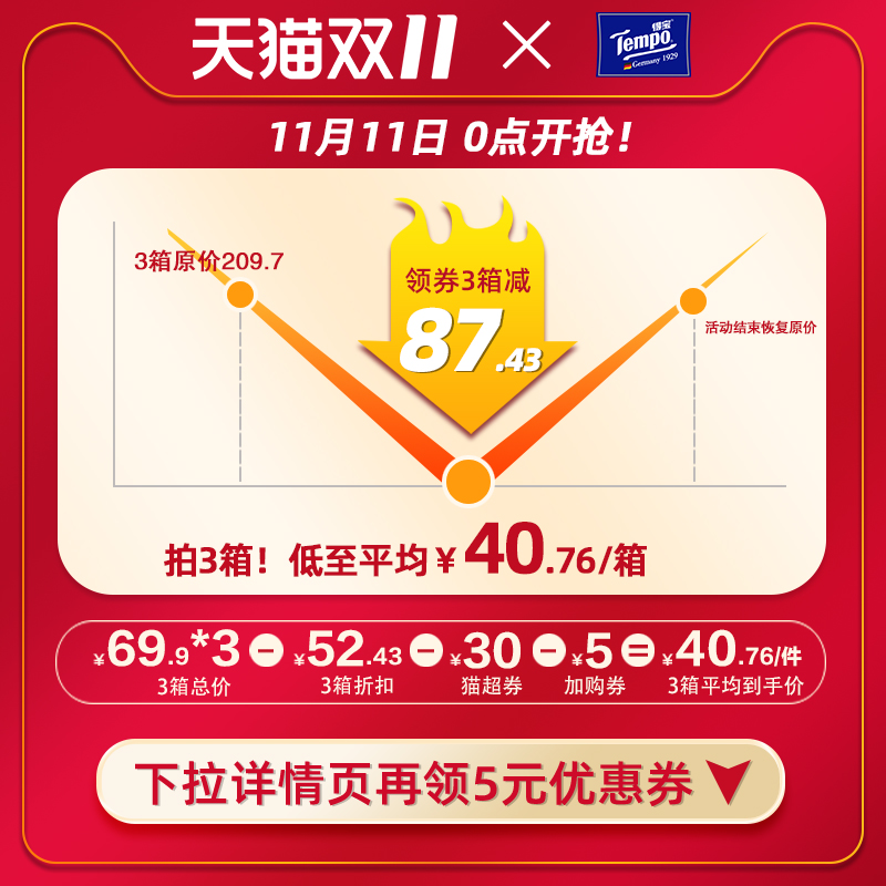 天猫超市11日19点售价69.9元,前15分钟2件7.5折,下单3件,叠加199-30元优惠券,叠加88VIP会员 折扣,到手价120.91元。折合每件40.3元,有需要的选购。