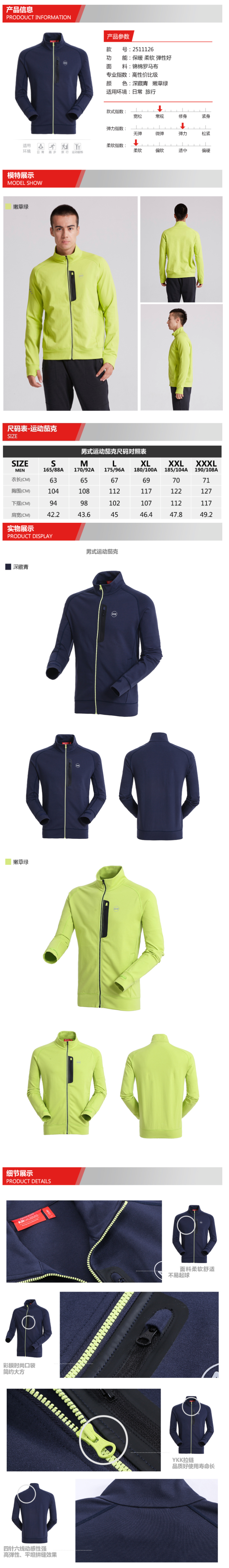 在款式和设计上,标准版型,袖口是弹力松紧+拇指扣的双设计,当跑步运动时穿,袖口不会碍事,更灵活。主门襟拉链是日本YKK;面料的拼缝上使用四针六线工艺,拼缝处平整,没有凸起处对皮肤的摩擦,更舒适。