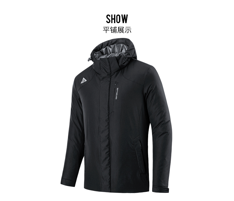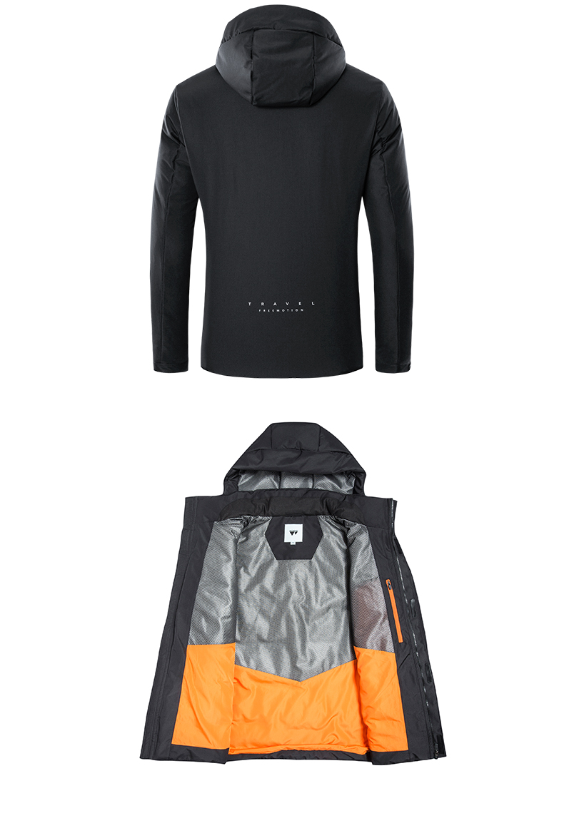 面料采用防泼水加贴膜处理,达到防风防泼水效果,同时保持衣服干爽舒适,兼顾耐磨性,舒适耐穿。合体修身版型,穿着不臃肿。多层面料结构,有效防风防钻绒。