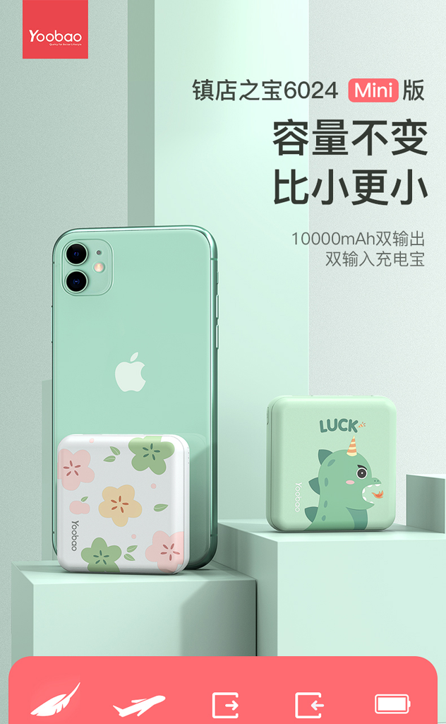 羽博是数码行业比较靠谱的国产品牌,质量并不输飞毛腿、绿联这些品牌。这款是安卓苹果手机通用的充电宝,型号: YB-6024,超薄快充,双USB输出,大容量10000毫安,带应急LED灯,稳定2A快充,尺寸仅有91*82*23mm,重量242g,精致轻巧便捷,携带方便。