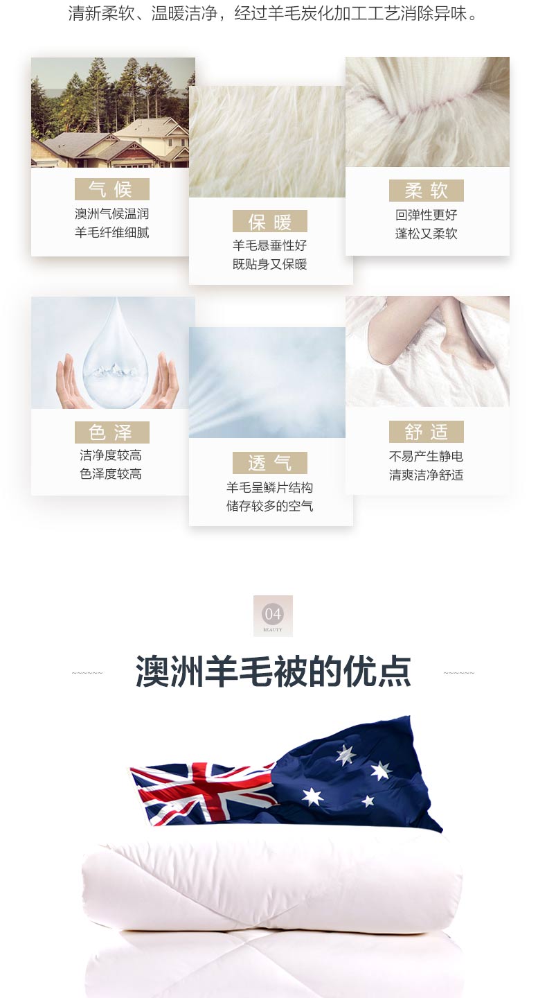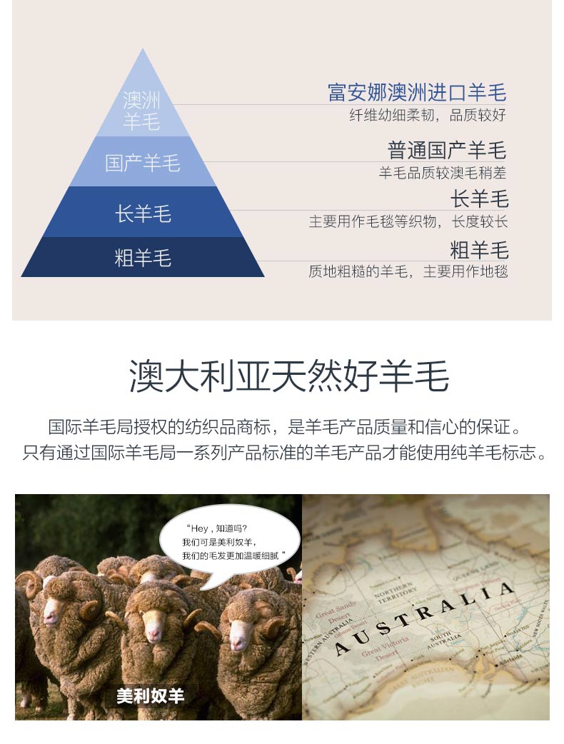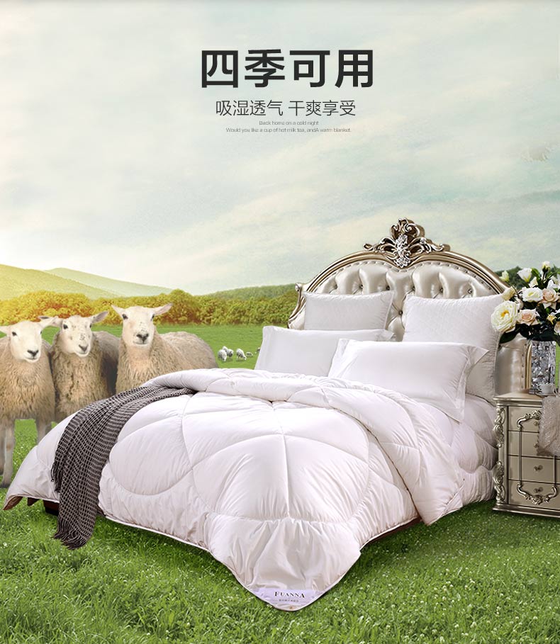 这款富安娜双人羊毛冬被,采用羊毛+聚酯纤维双重填充,即蓬松透气又亲肤保暖,结合了2种纤维的有点,相比纯羊毛,优势在于可以填充的很均匀,不易结板打团,不易变形,可以保持长久的蓬松和回弹,其中羊毛中角蛋白成份与头发相同,能吸收大量水气并快速挥发,天然抑菌抗臭,不捂汗不燥热,根据体温变化产生反应,一年四季都给人舒适恒温之感。