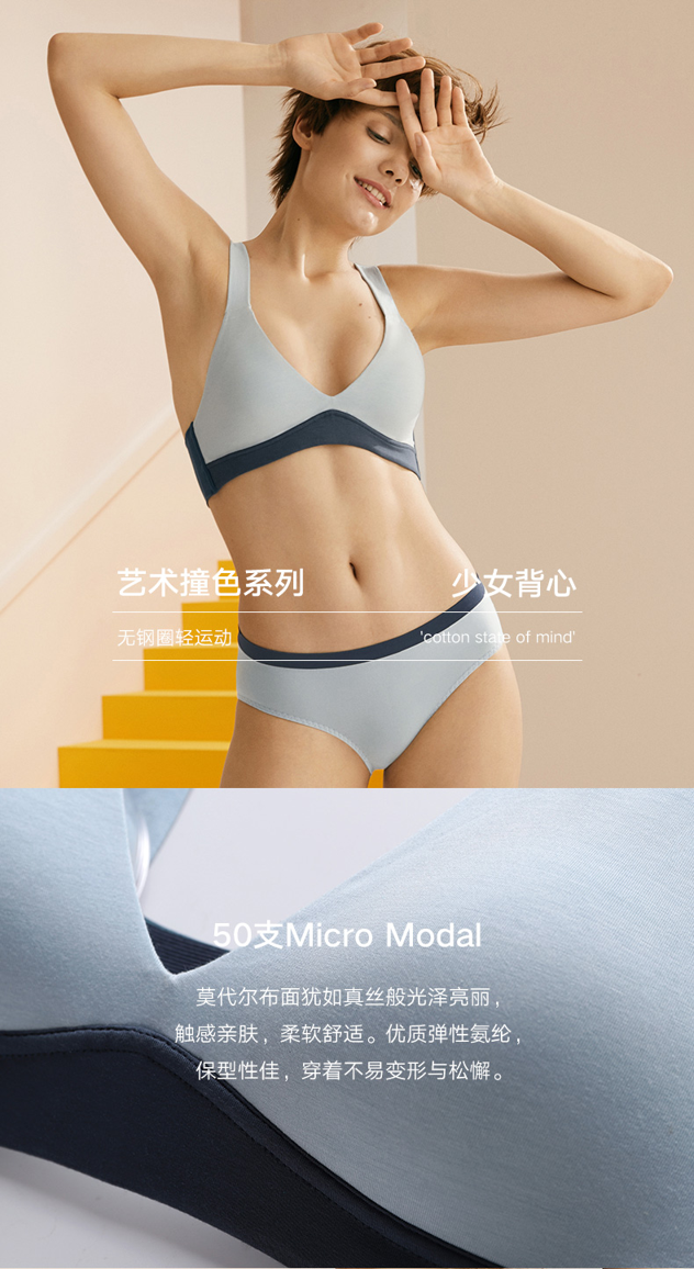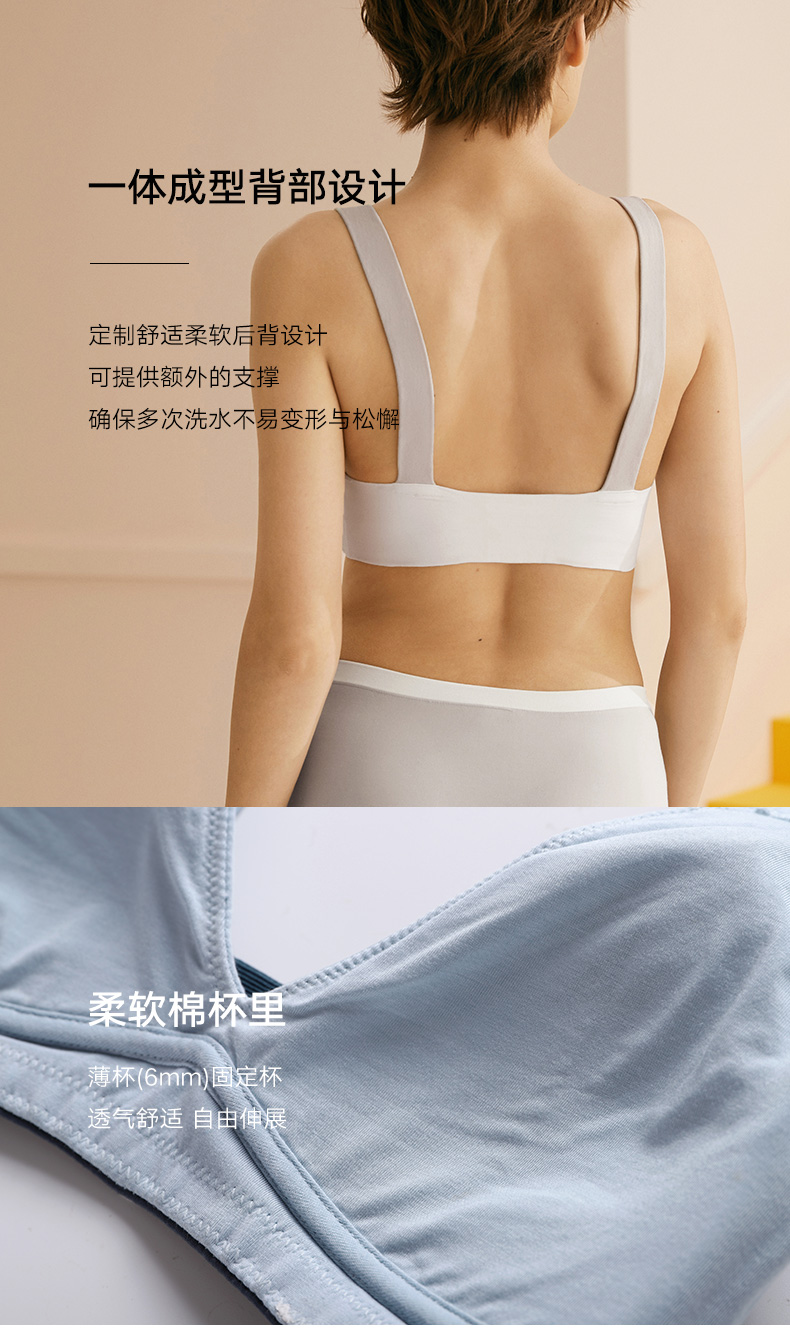 这款曼妮芬 棉质生活无钢圈运动舒适背心文胸,50支超细莫代尔纤维,莫代尔布面犹如真丝般光泽亮丽;触感亲肤,柔软舒适;优质弹性氨纶,保型性佳,穿着不易变形与松懈。无钢圈轻运动,6mm薄杯,透气舒适;一体成型背部设计,提供额外的支撑,确保多次洗水不易变形与松懈。可调节宽肩带,减压减震有效缓解肩部压力。