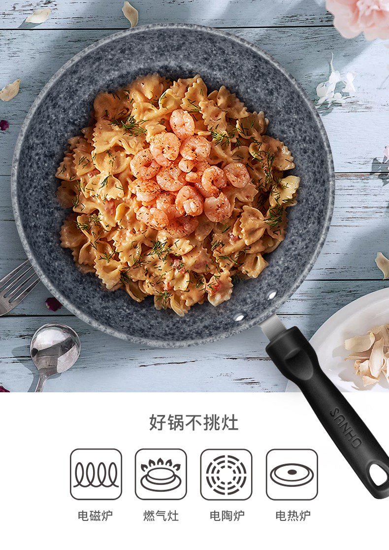 同时运用Impoct Bounding铸造技术,底厚壁薄,传热均匀,可充分做到高温爆炒无油烟,可拆卸仿木胶质手柄,抗菌防烫,适用于电磁炉、燃气灶台、电陶炉、电热炉。