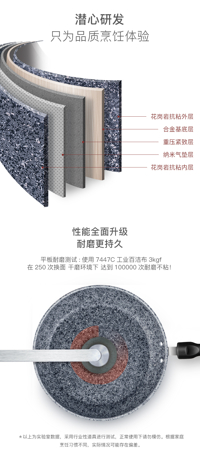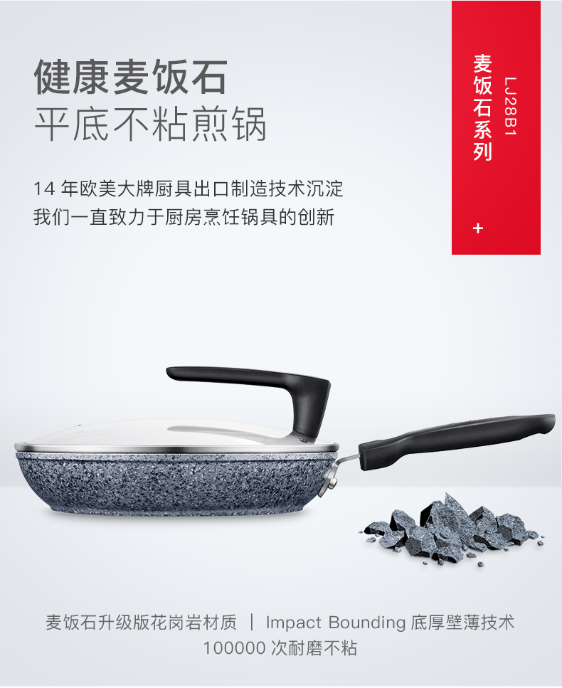 这款平底锅直径为28cm,深5.5cm,锅体是用花岗岩抗粘层、合金基底层、重压紧致层、纳米气垫层、不锈钢导磁快热层压制而成,非常耐磨,可做到100000次不粘;