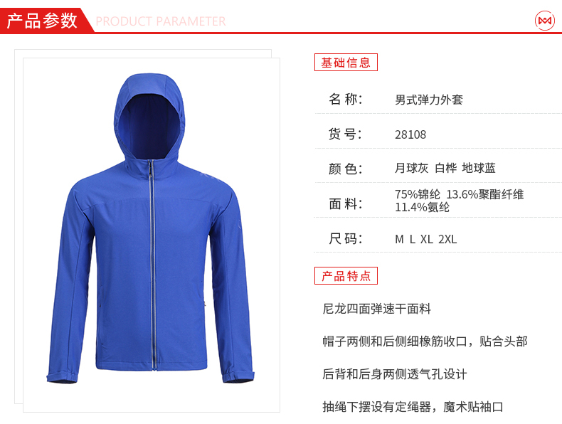 这款连帽外套是锦纶+聚酯混纺而成,耐穿速干透气,拥有四向弹力,后身还有透气孔。
