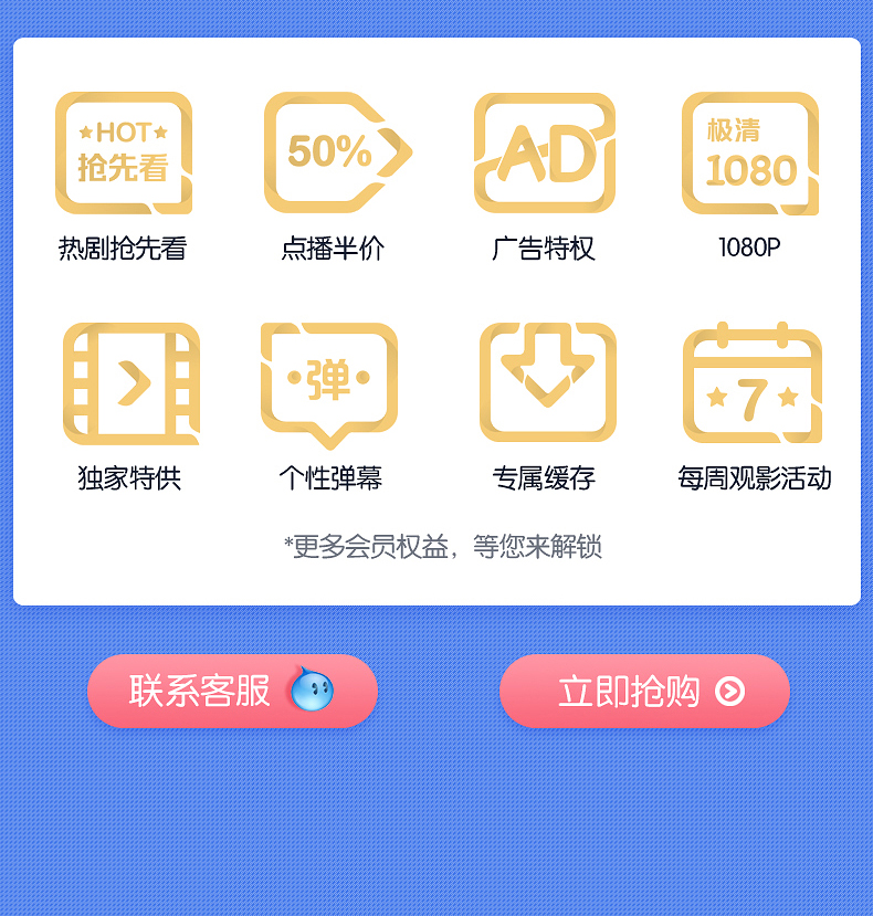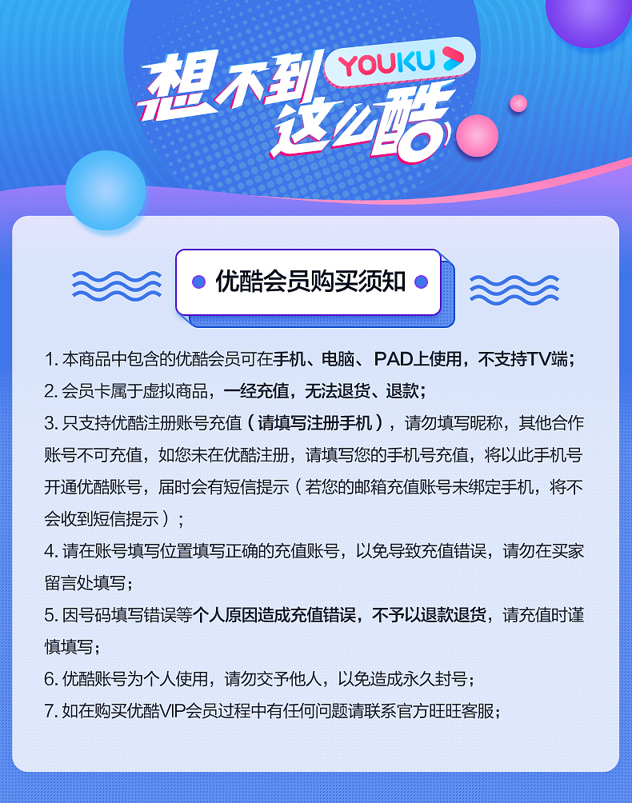 天猫优酷会员官方旗舰店,¥199元 狂欢价,-100元优惠券,=99元 到手价,优酷会员官方旗舰店,官方秒充。只能在手机、电脑、iPad上使用,不支持TV端。下单时需要填写优酷的账号,如果没有的,可以去注册一下。具体福利有免广告,热剧抢先看等等。