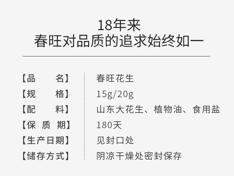 春旺 连续11年入选东方航空精品休闲小食,这款盐焗/麻辣花生米,东航南航配餐专用,氮气保鲜。精选山东优质大花生,经18道工序粒粒精选,去除坏果,不添加色素、香精、防腐剂、精控火候,受热均匀,盐焗口味,适合下酒配菜,外出野餐,办公室零食。规格:15g*40袋。