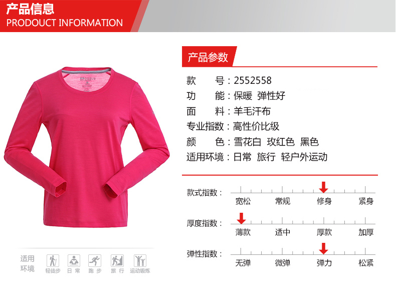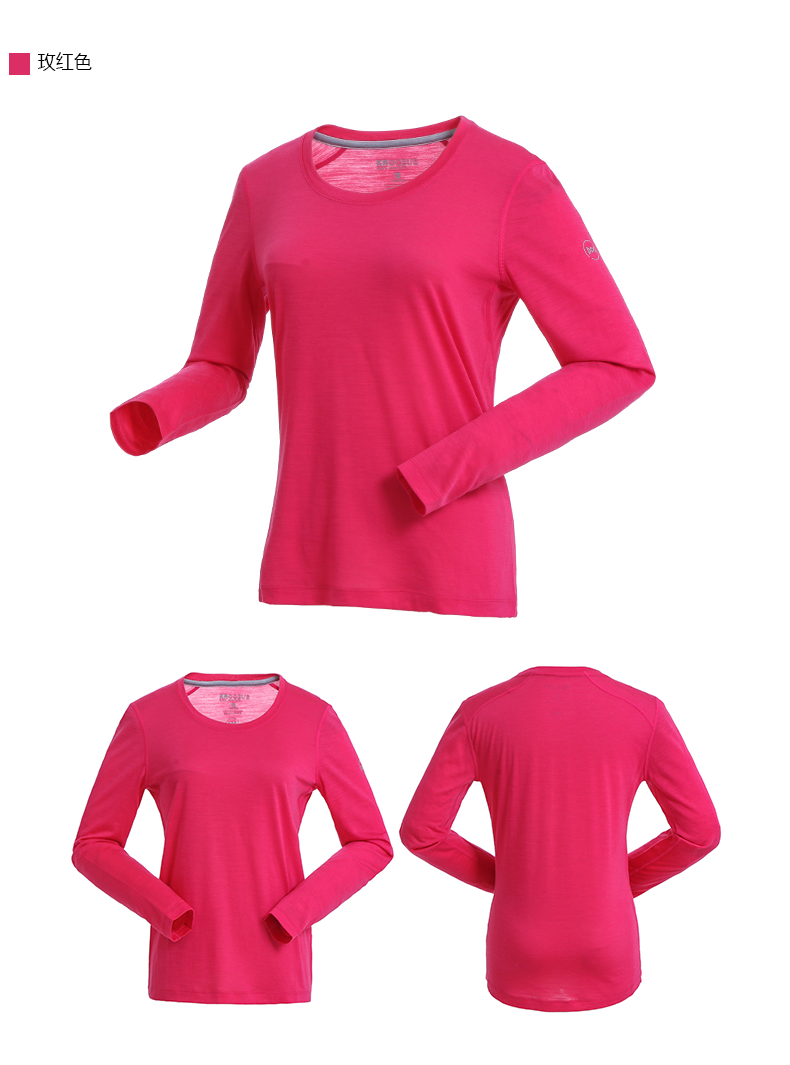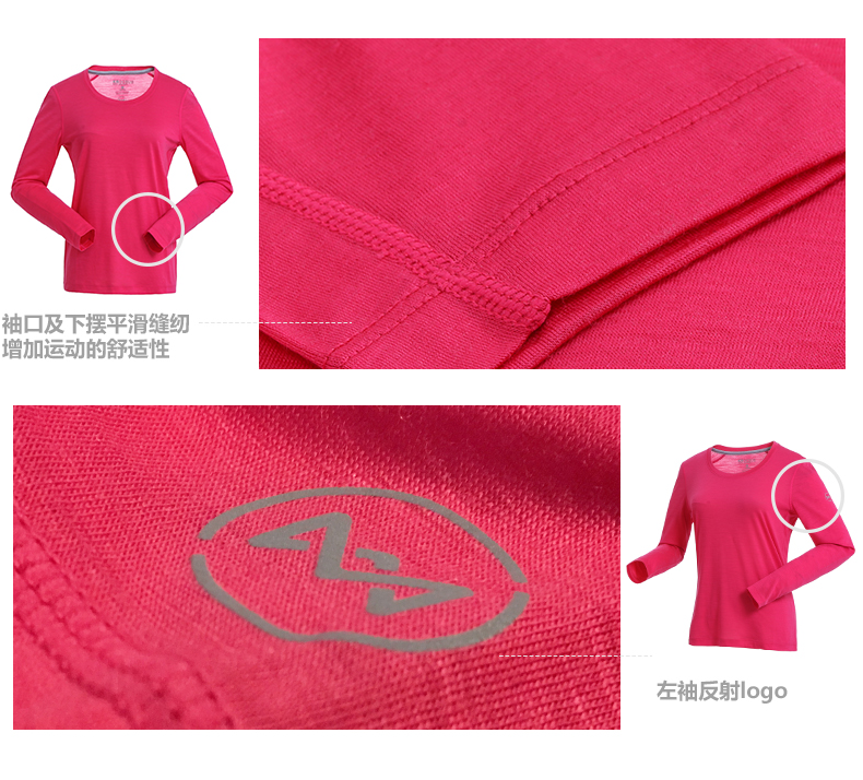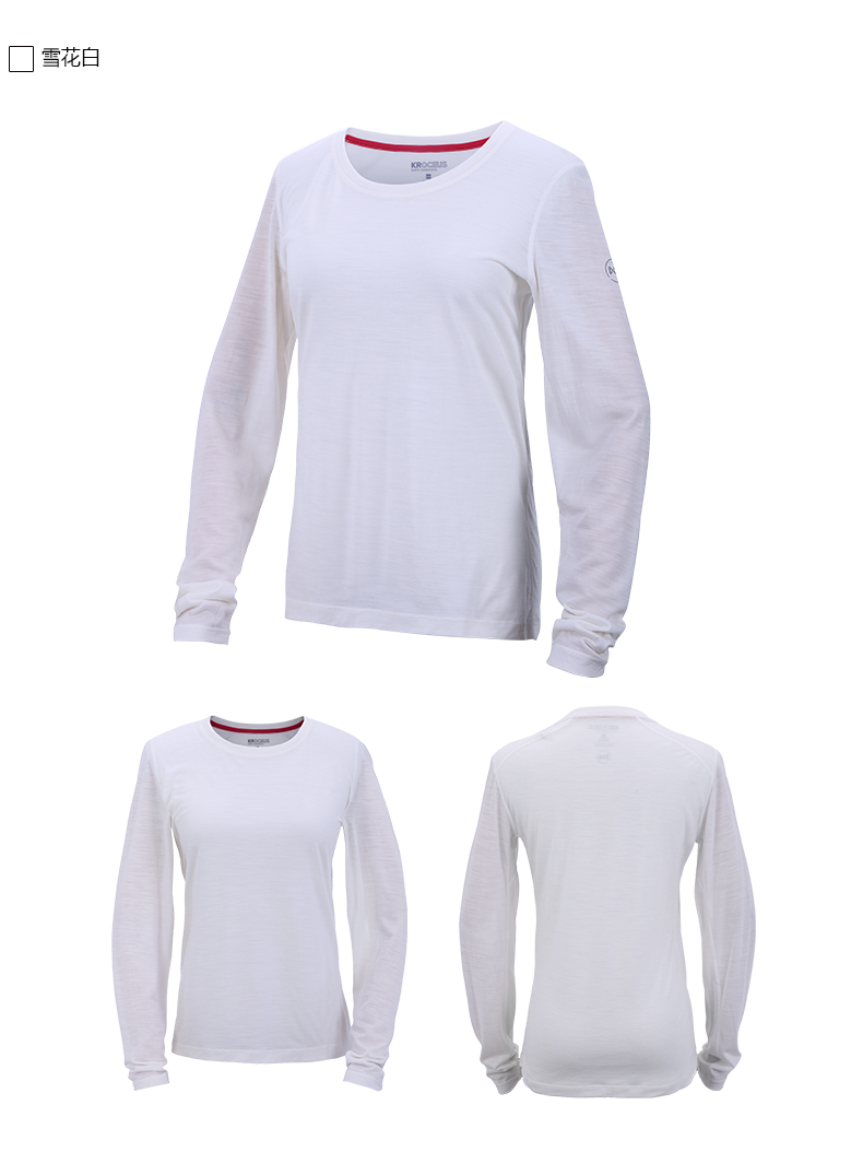 这款地球科学家女长袖T恤是春秋款,采用含美利奴羊毛的混纺面料制成,衣服摸起来的手感非常柔软完全不会不扎人,贴肤穿完全没有问题,还有速干透气抗异味的功效,比尼龙、聚酯的功能更好、档次更高、亲肤性也更佳,缺点就是不那么耐折腾。