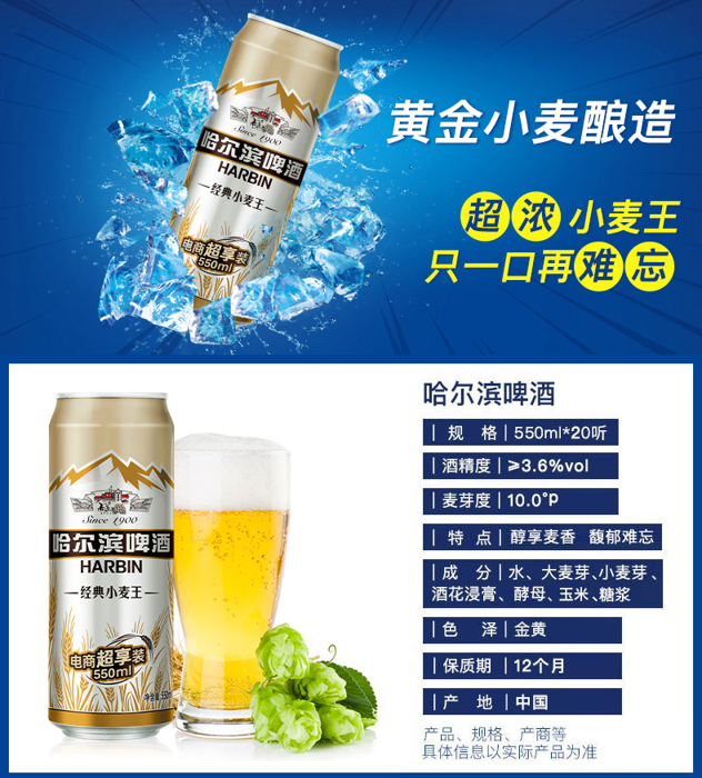 这款哈尔滨小麦王啤酒优选黄金小麦酿造,传承百年哈啤醇正风味,口感平顺甘醇,泡沫浓厚,麦芽度为10.0°P,酒精度≥3.6%vol。