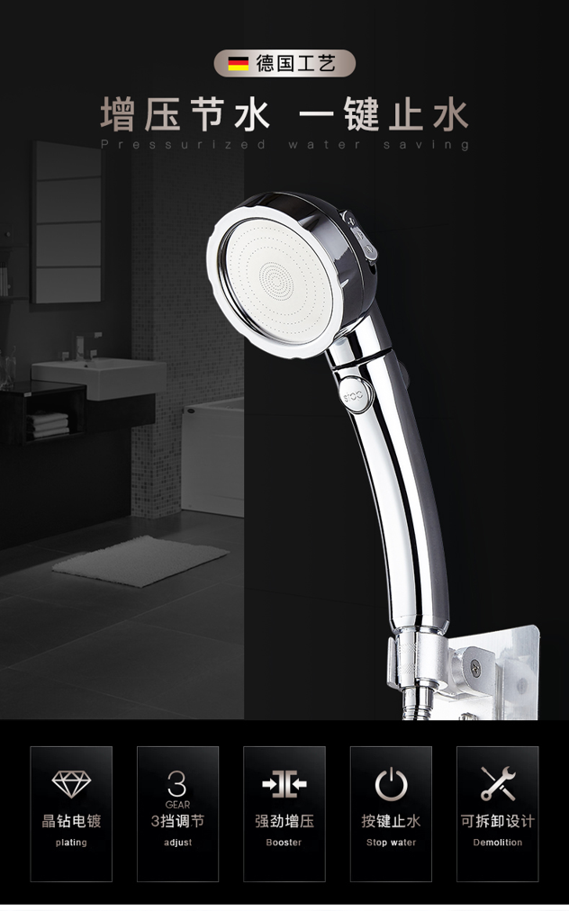 花洒使用优质ABS材质制成,耐高温、耐磨损、抗冲击力强;通用4分接口,基本所有家庭都能用。花洒有强力增压设计,LUV矩阵群控增压,搭配多分布的细孔,出水细腻范围广。自带一键止水设计,最顶端的喷头可以360度旋转;拆掉头部,还自带喷枪出水功能。