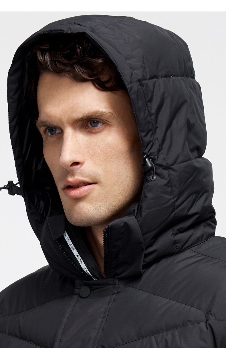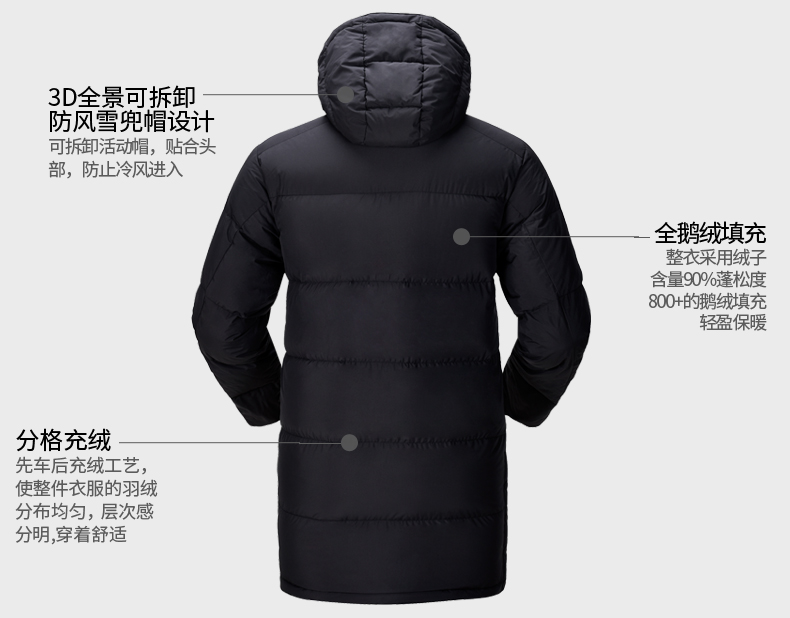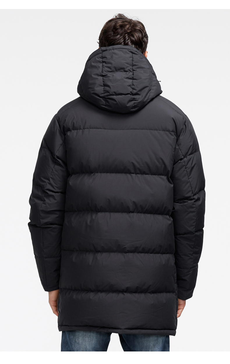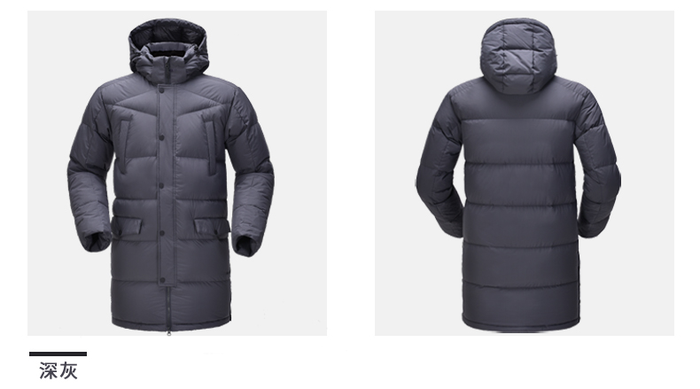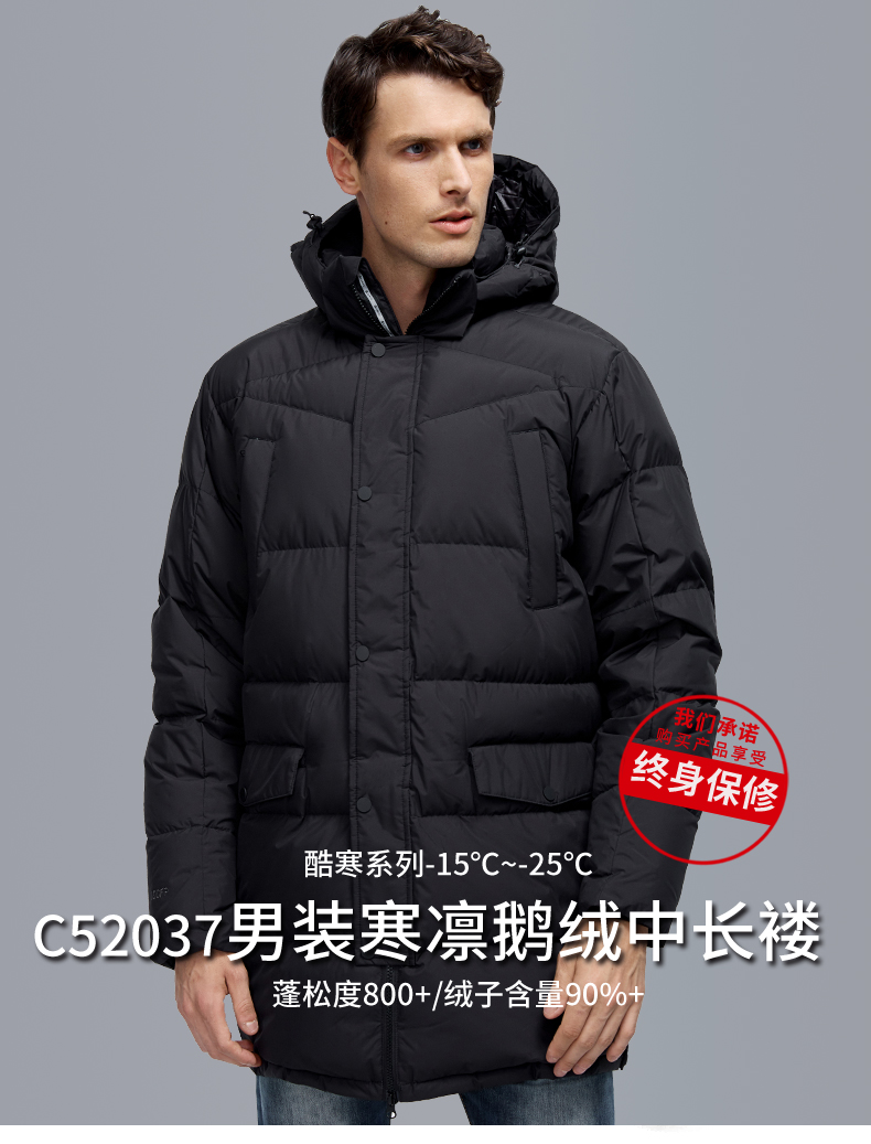 这款君羽寒凛男中长款羽绒服,属于酷寒款,可抗-15℃~-30℃,内里填充了800蓬90%鹅绒,L码充绒量达221克,属于重装羽绒服了额,外层是东丽30D高密度锦纶面料,防风防雨雪。直筒微收腰版型,长度过臀及大腿。
