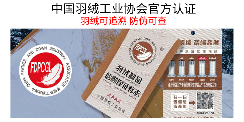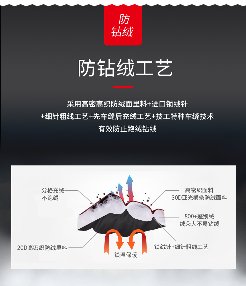 「防钻绒处理」面料与填充的羽绒,使用先车出羽绒隔舱,后充绒的方法,在制作外层面料过程中,羽绒隔舱就预先织出来,后填充羽绒,这样可有效避免羽绒从针眼钻绒。