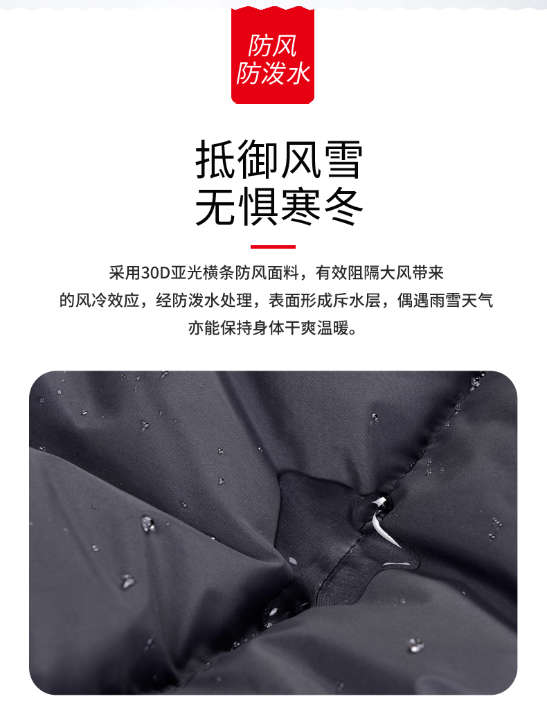 外层面料上,使用东丽30D高密度锦纶面料,能很好的防风,还经过防污抗泼水处理,可以保持面料长期干爽、洁净。羽绒采用先车出羽绒隔舱后充绒的方式,缩绒针细针眼搭配粗线的防钻绒工艺。
