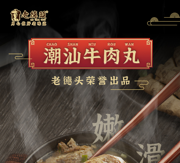 汕头老德头,算是比较有名的食品加工品牌了,十六届亚运会指定供应商,沃尔玛商超也有上架销售,正宗潮汕风味。 只使用腿牛肉,不含硼砂、弹力素、防腐剂,使用铁棍捶打,使肉成浆而纤维不断,在经过浸入蟹眼水中定型,使其口感弹爽鲜嫩,更加劲道。