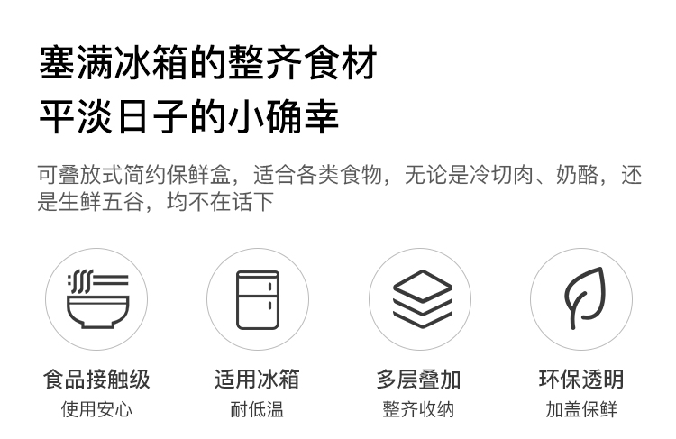 每个收纳盒配有单独盒盖,避免灰尘和潮气进入,保证食物的新鲜品质。收纳盒顶部采用凹槽式设计,可以叠放,能充分利用空间。