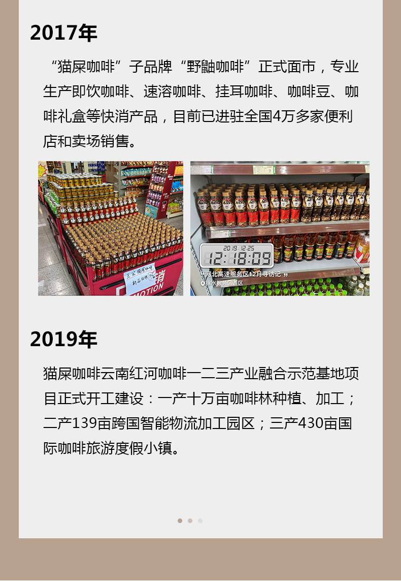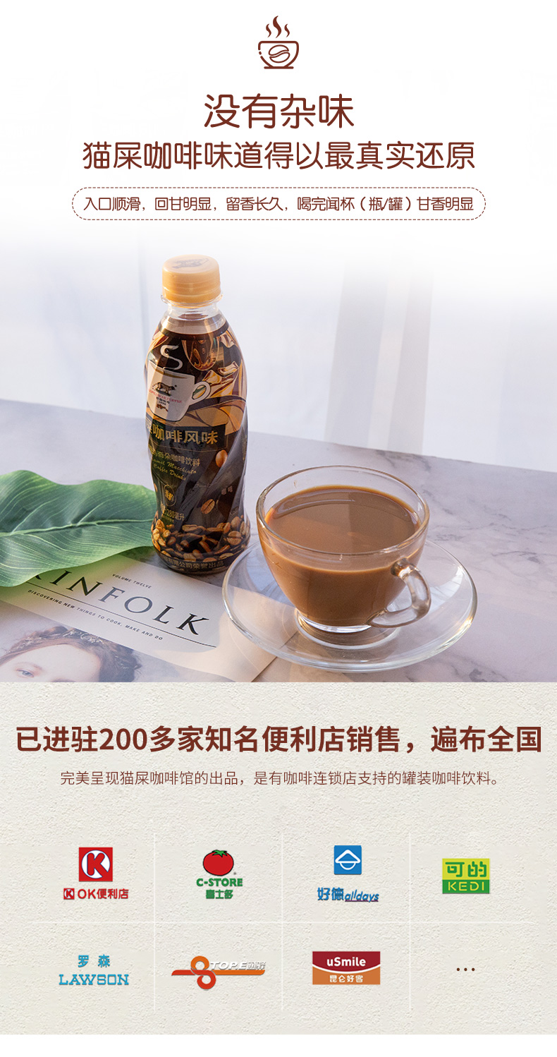 野鼬咖啡是东洋饮料(常熟)有限公司旗下品牌(官网),东洋饮料旗下的主要品牌是三得利、同时还是加多宝、百事、中粮、怡宝等产品的生产商。对于大牌的瓶装猫屎咖啡,这是非常好的价格,编辑入手尝鲜了。
