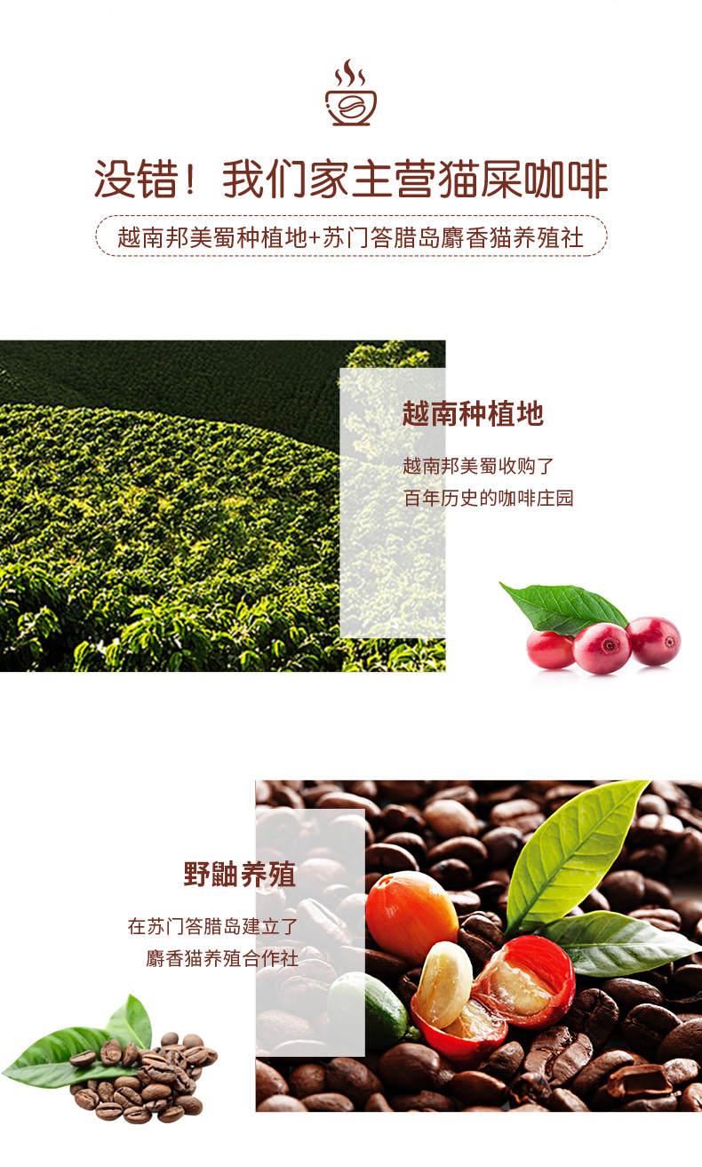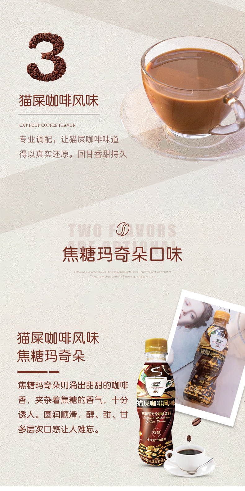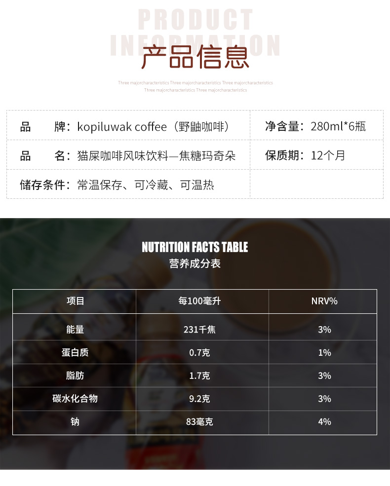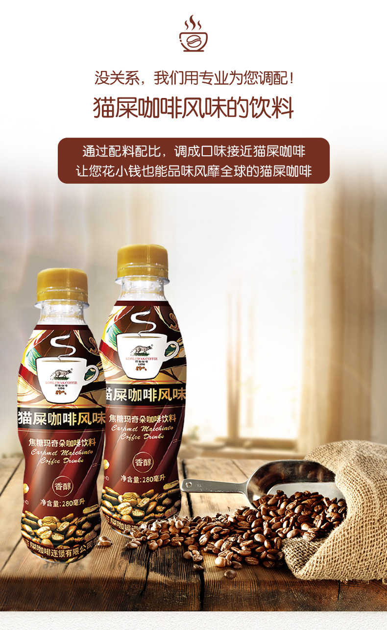 这款猫屎咖啡采用越南邦美蜀种植地的阿拉比卡咖啡豆,让苏门答腊岛麝香猫养殖舍的猫食用后所得,再经过精心烘焙和科学萃取,焦糖玛奇朵的甜甜咖啡香涌出,夹杂着焦糖的香气,十分诱人。