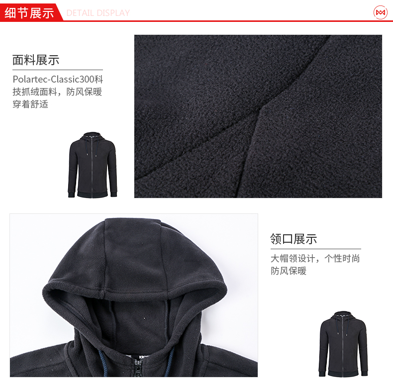 在款式上,这款抓绒是修身版型,半高立领可以很好的护住脖子,主拉链使用知名日本YKK拉链,两侧插袋也有拉链,袖口和下摆都有罗纹弹力设计,保暖不倒灌风,无论是直接外穿或者作为保暖层内搭都行。