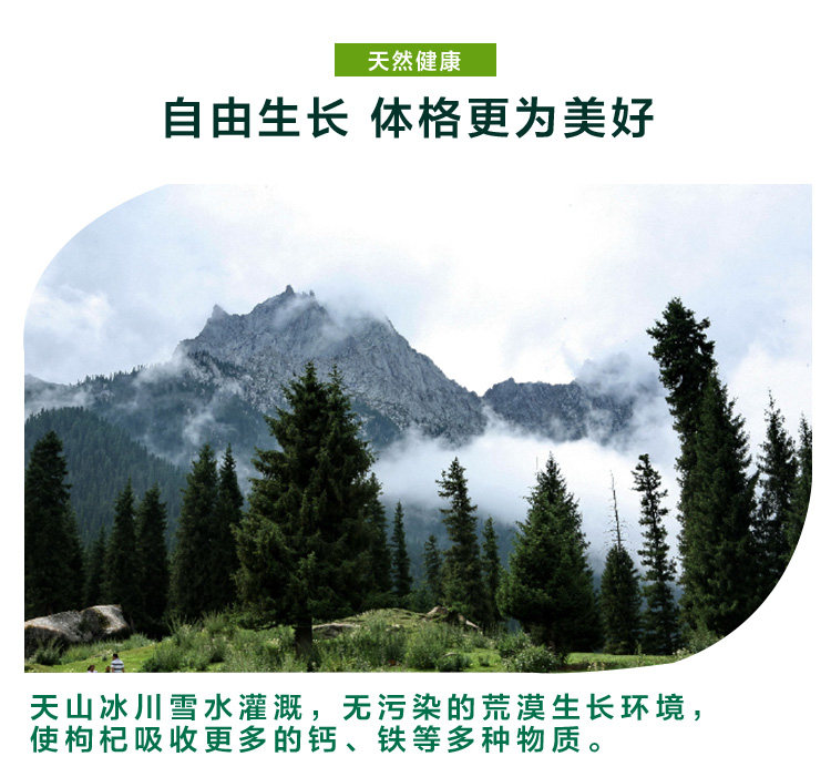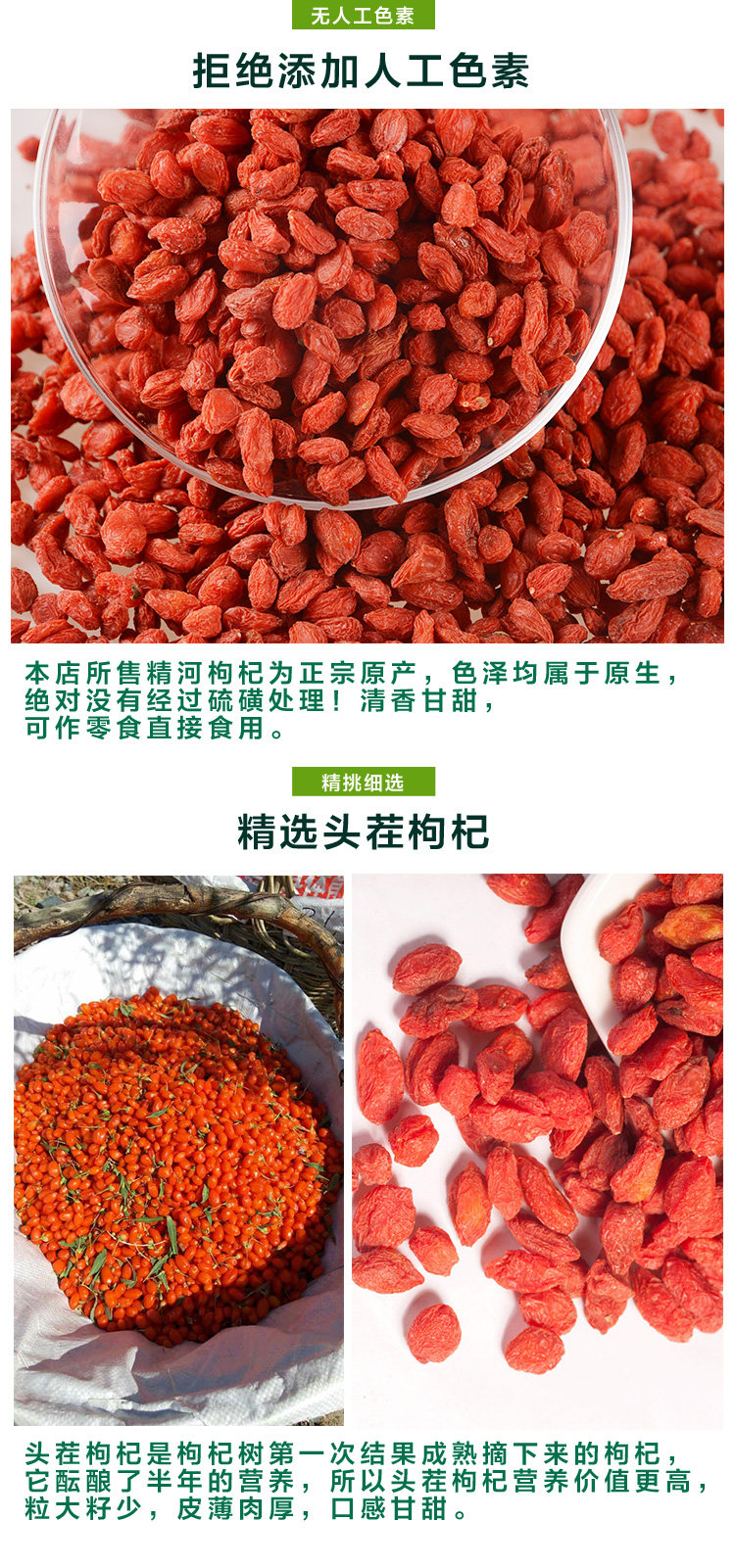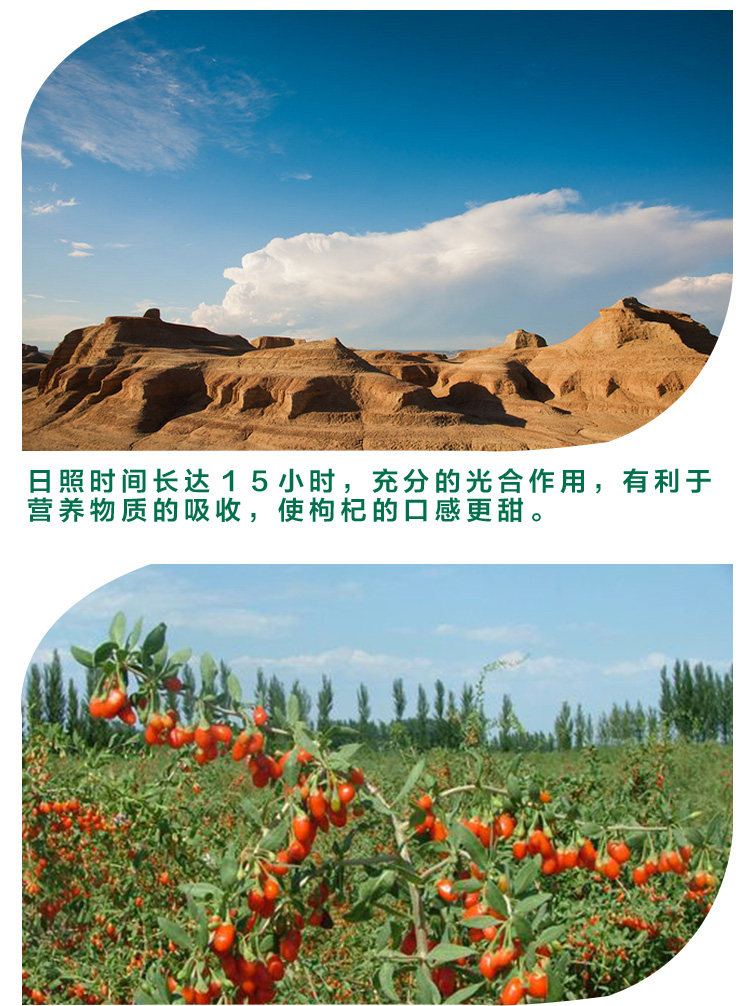 此款枸杞产自新疆精河,生长于无污染的荒漠,由天山冰川雪水灌溉,含有更高的钙、铁等营养元素。日照时间长达15小时,光合作用更充分,口感更甜。天然晾晒,绝对没有经过硫磺处理,不染色,可直接食用。颗粒大小200粒/50g,中等颗粒枸杞,纯天然晾晒,没有任何加工,经过新疆乌鲁木齐农科院食品药品科化验,各项农残远低于行业标准,获得绿色农产品认证。