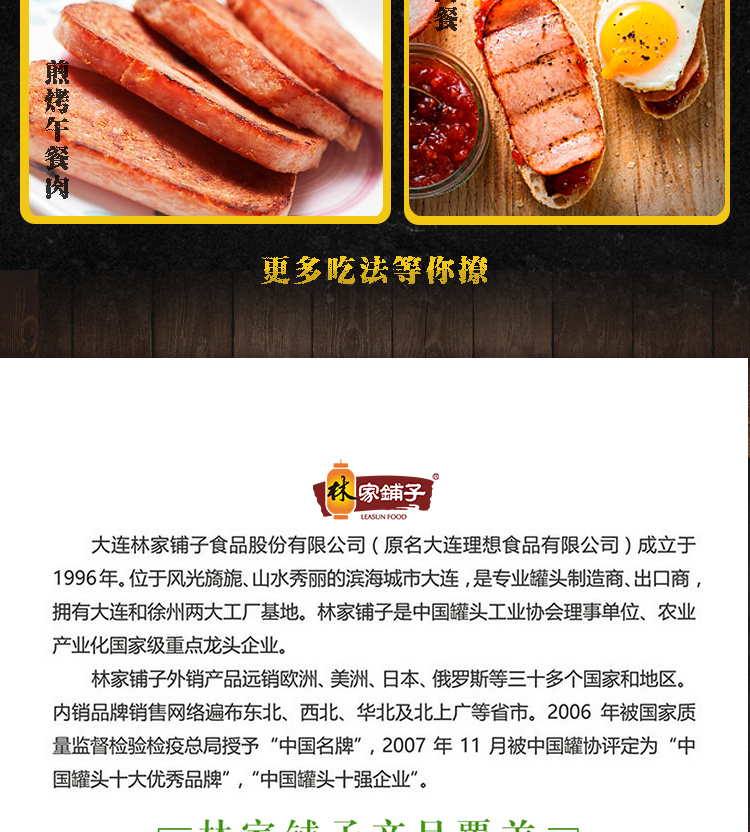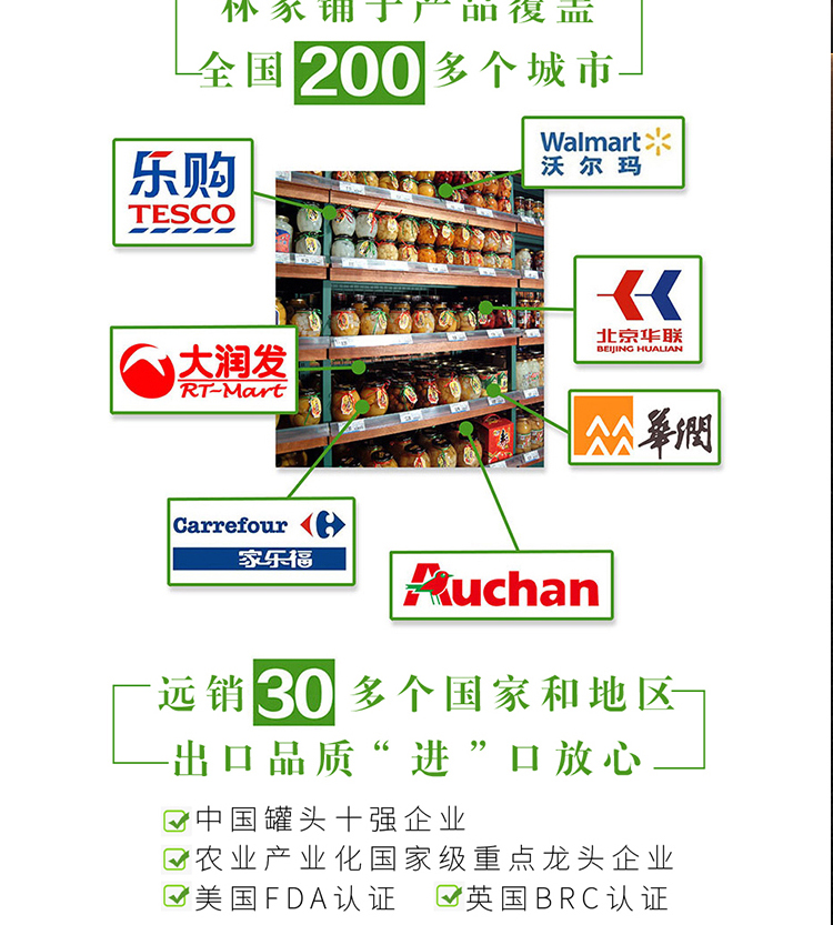 大连林家铺子食品远销欧洲美洲日本等30多个国家,是中国罐头十强企业,产品经过美国FDA认证,英国BRC认证,是可口可乐,沃尔玛,亨氏等著名食品企业的原料供应商,品牌和实力过硬。领券链接点此