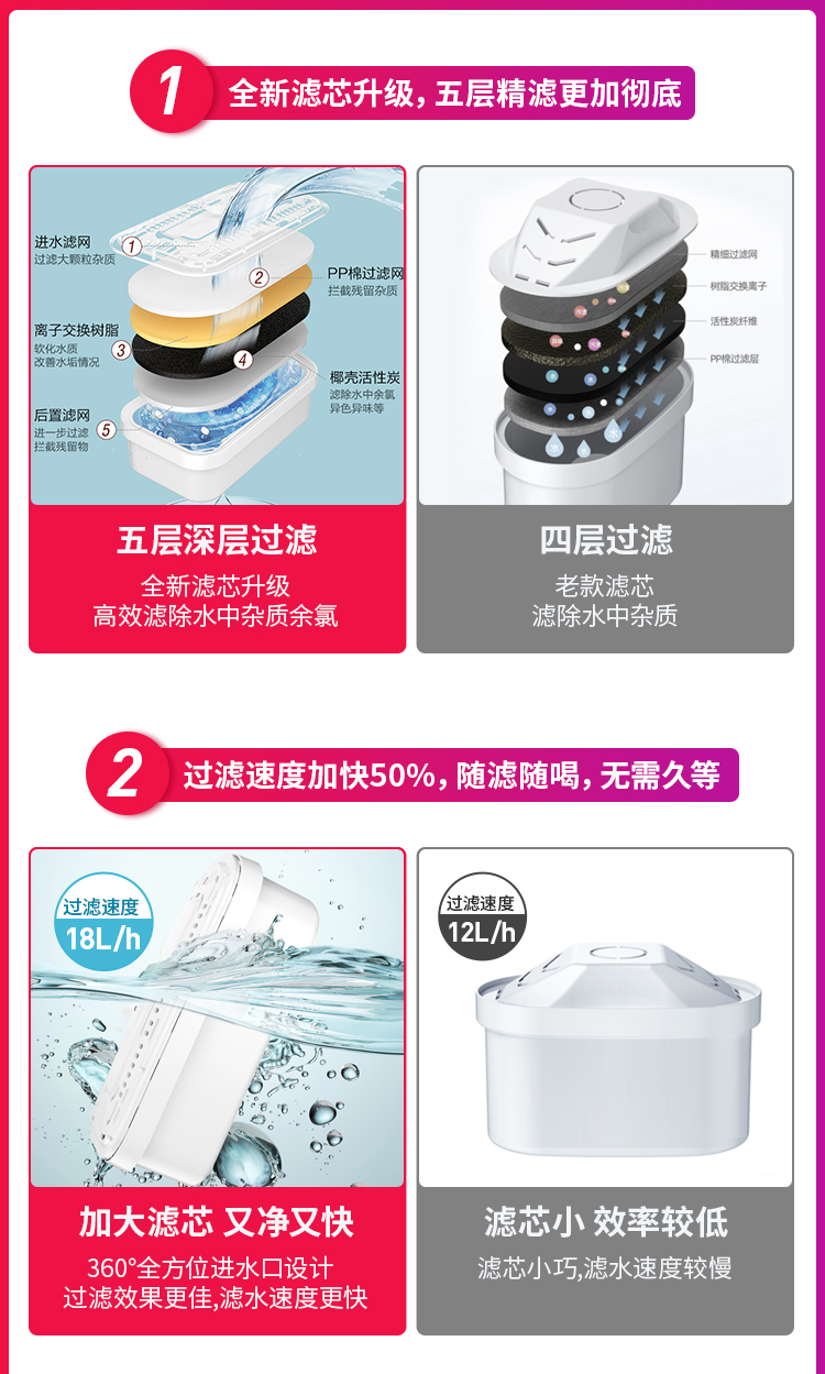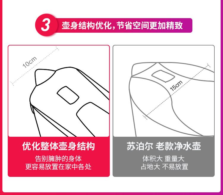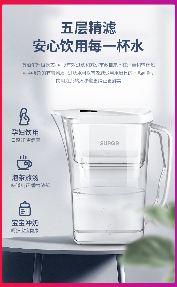 天猫苏泊尔石榴王专卖店129元,下单立减30元,可领40元优惠券,实付59元到手,苏泊尔升级大容量净水壶,优质进口滤材,5重精细过滤,有效隔绝铁锈,滤除余氯、重金属等有害物质,加大滤芯,360度全方位进水口,过滤效果更佳,水箱分离设计,避免滤芯长时间浸泡,防止原水和净水混合。壶身经过合理优化,侧身纤薄,仅有10cm,更好收纳。