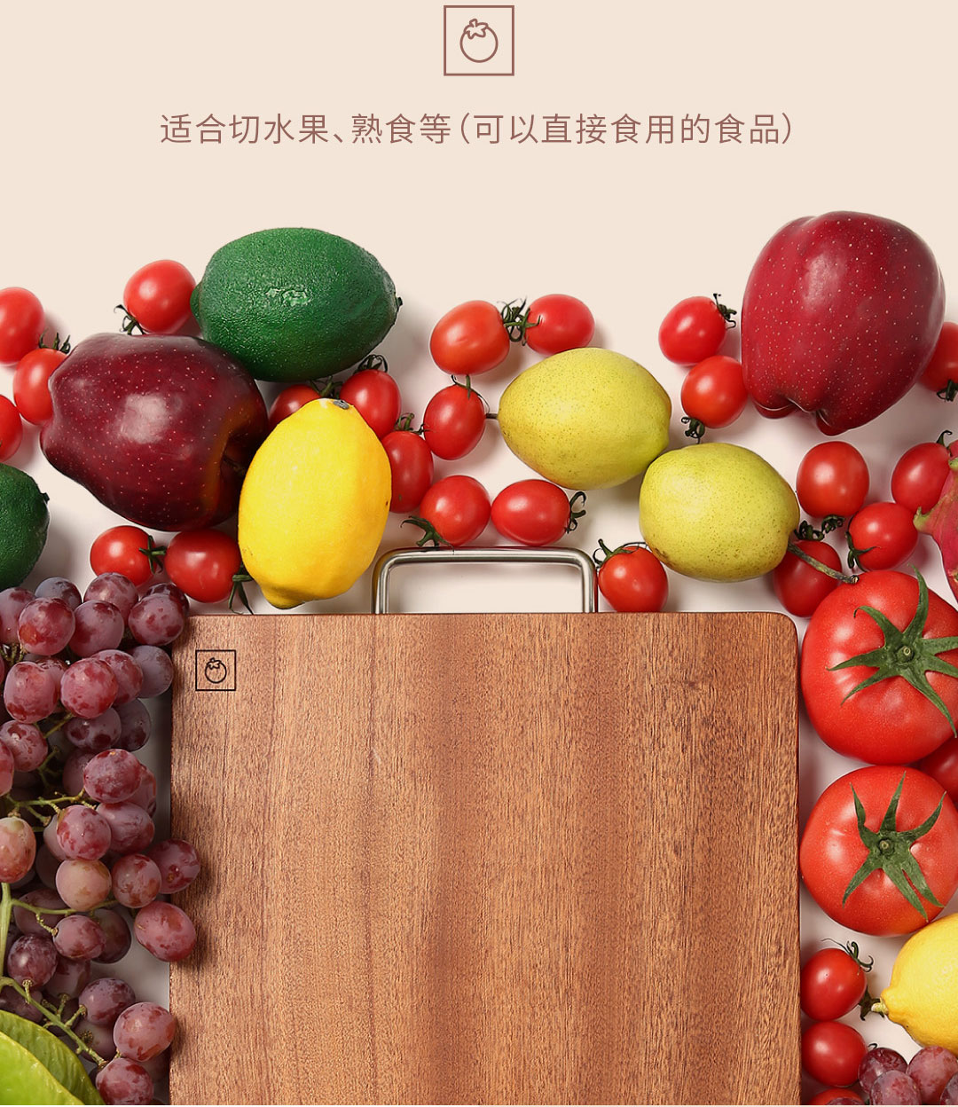 细节方面,砧板的角上有小鱼和西红柿的图案,能有效的分辨正反,方便使用时生熟分开,顶部为304不锈钢把手,能承受80kg的拉力,底部是圆角扣手,方便使用,设计贴心周到。