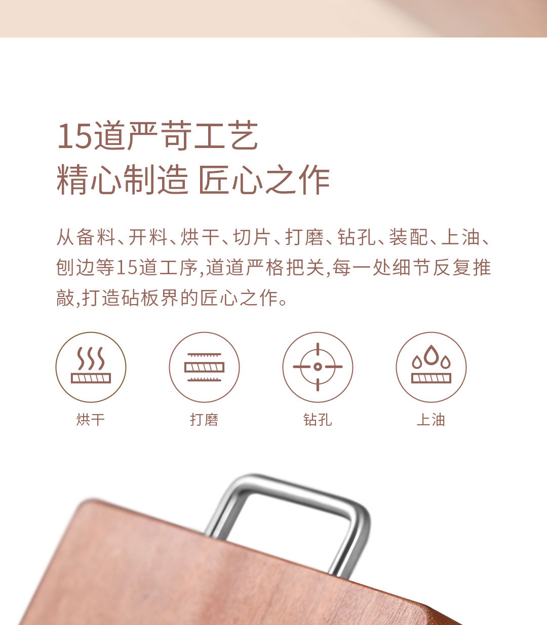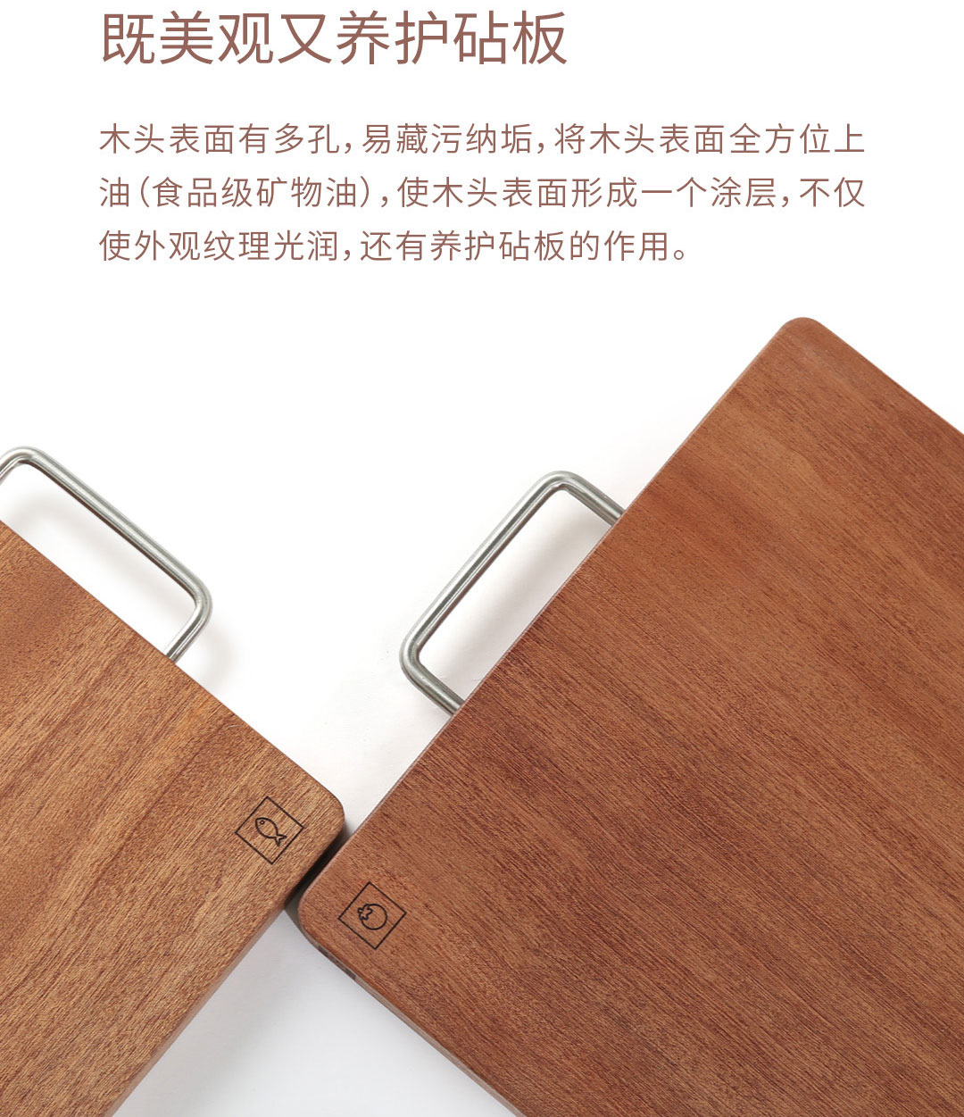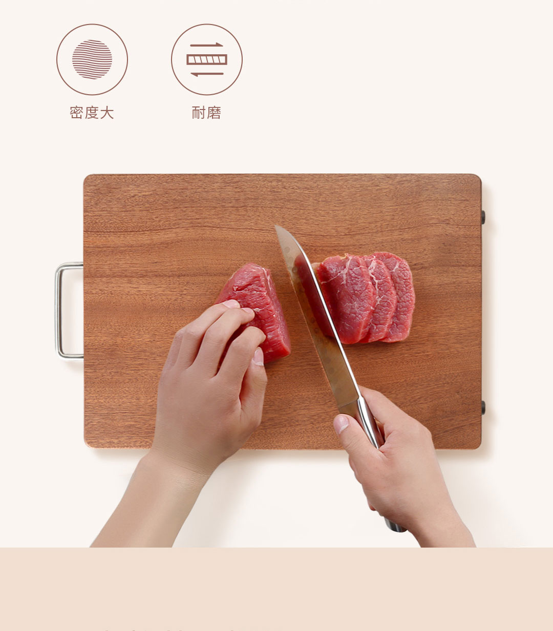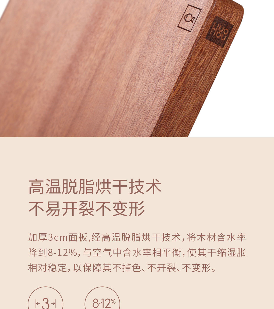 砧板加厚3cm,经过高温脱脂烘干技术,将木材的含水率降到8%-12%,使空气中的含水率相平衡,久用不掉色、不开裂、不变形,表面上了一层食品级矿物油,能有效养护砧板。
