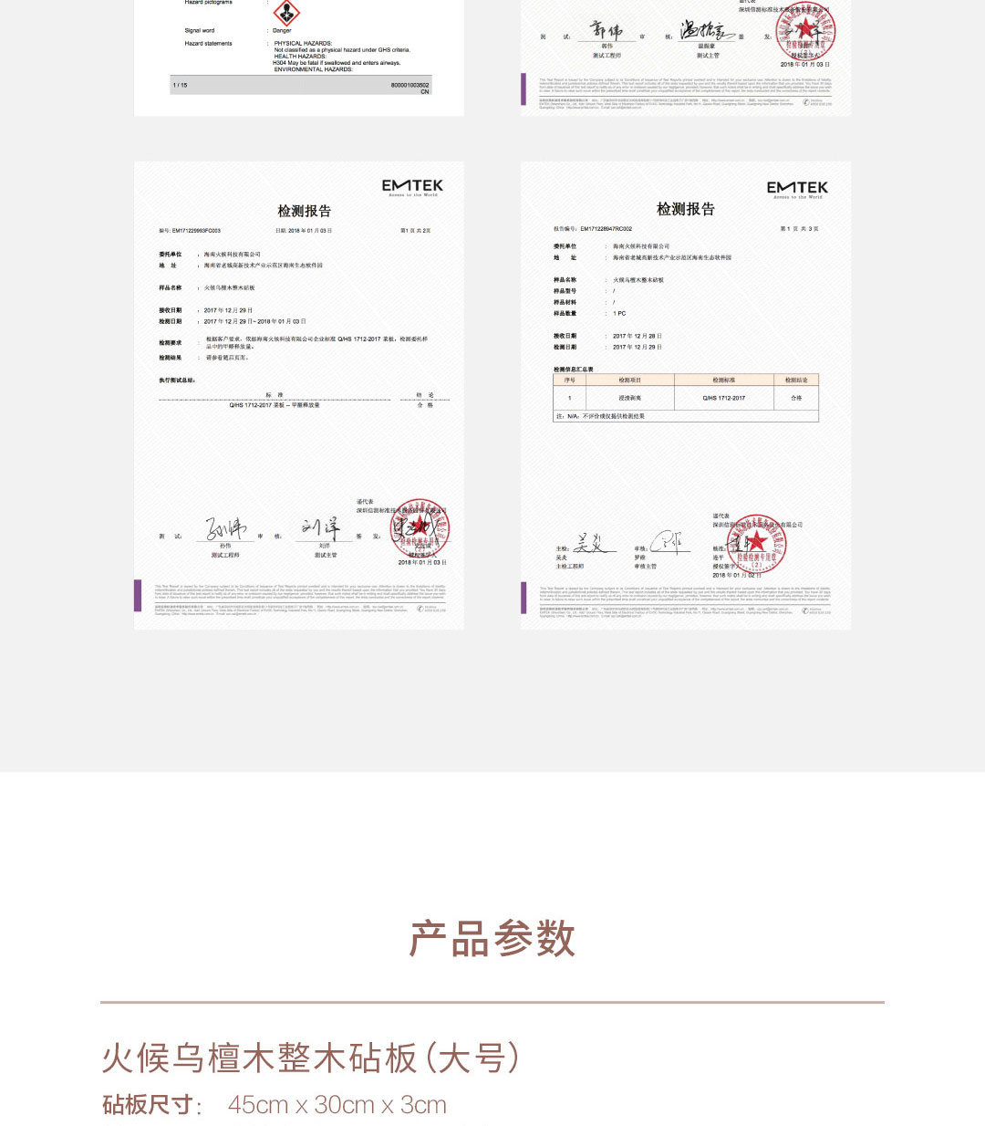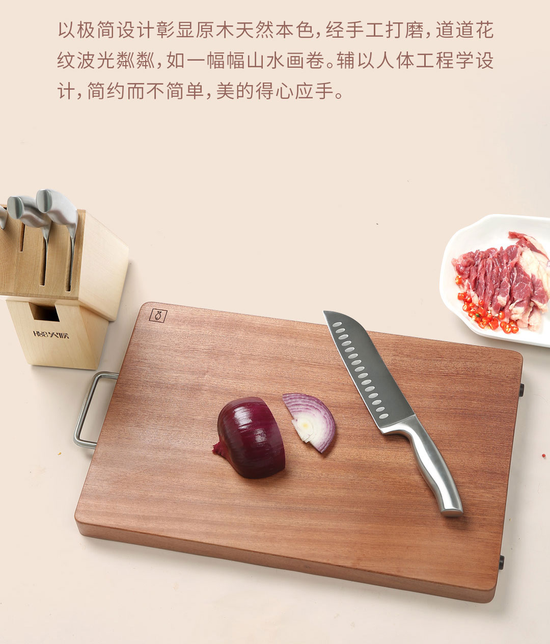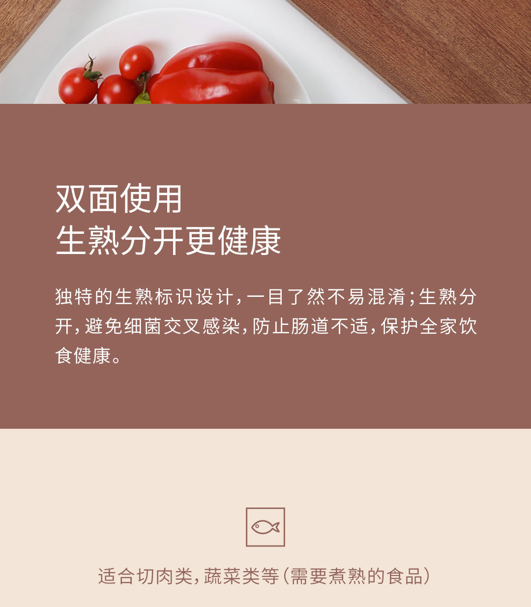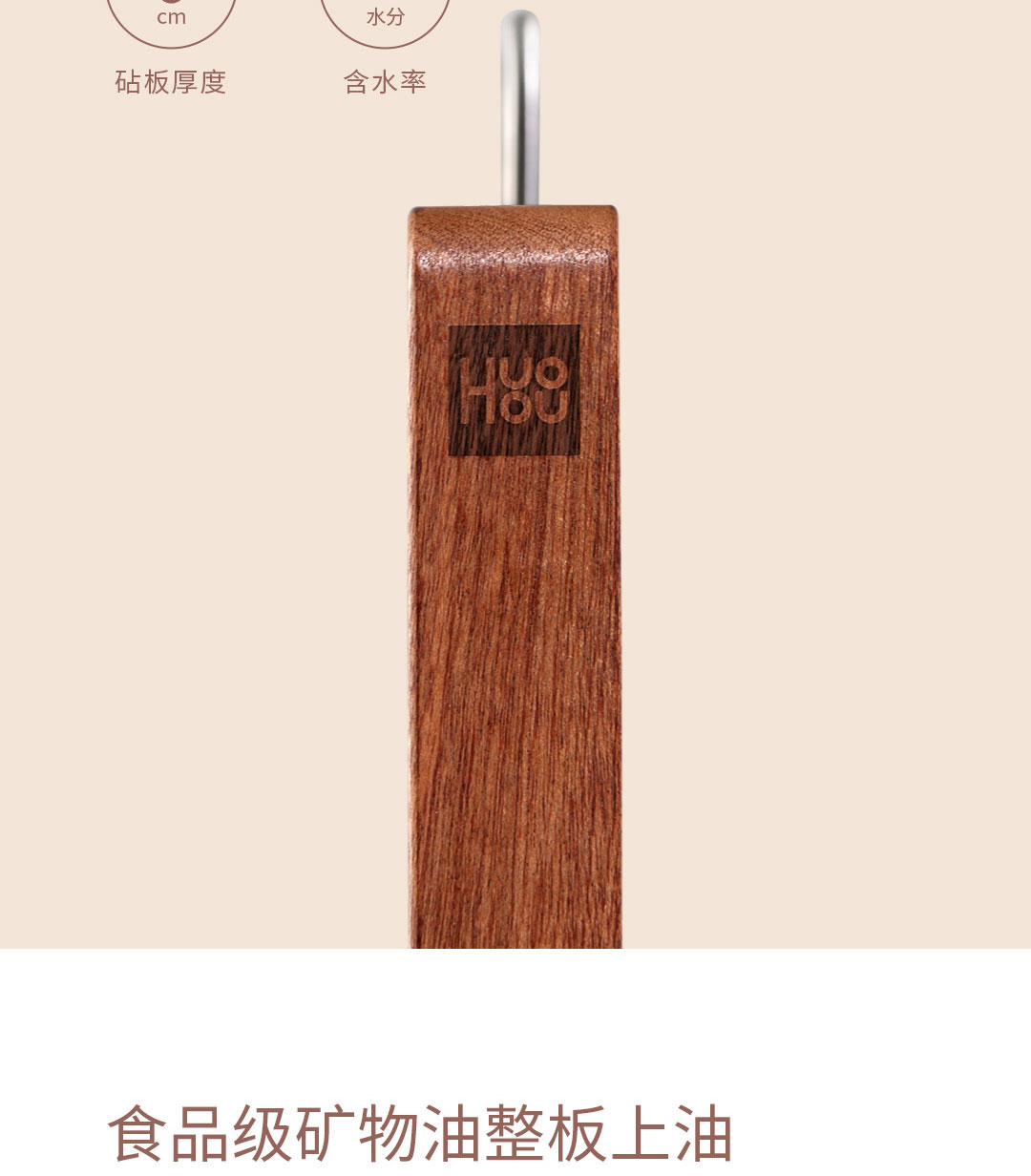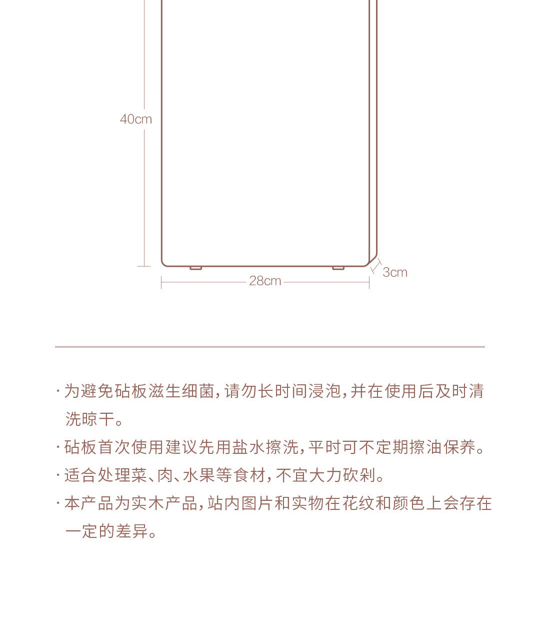 砧板加厚3cm,经过高温脱脂烘干技术,将木材的含水率降到8%-12%,使空气中的含水率相平衡,久用不掉色、不开裂、不变形,表面上了一层食品级矿物油,能有效养护砧板。