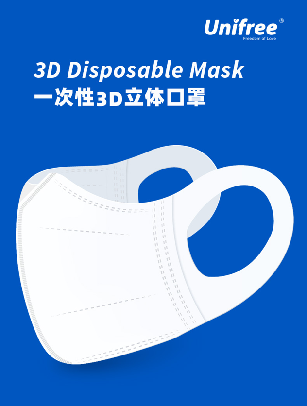 这款unifree 一次性3d立体口罩,外层无纺布,中间熔喷过滤布,内层无纺布,三层防护,过滤空气中的多种有害物质。立体剪裁,适合大多数脸型,舒适贴合,鼻梁处折角佩戴效果更贴合,密封性更好。无纺布耳带,透气,抗拉扯,佩戴舒适。